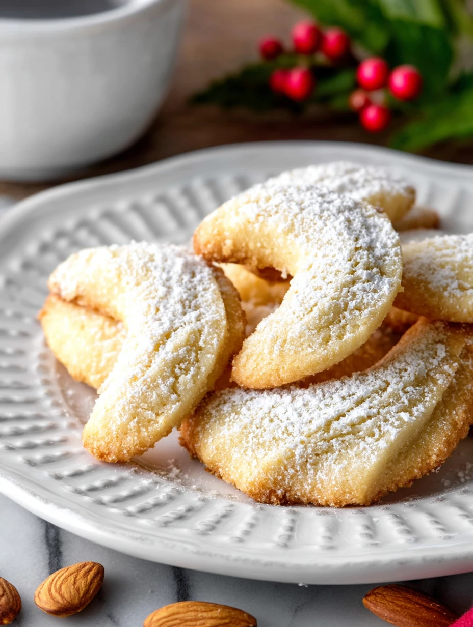 What makes them truly special is their versatility. Whether paired with a hot cup of coffee, nestled next to other holiday sweets, or enjoyed as a quick bite of joy, Almond Crescent Cookies bring old-world charm and elegance to every bite.