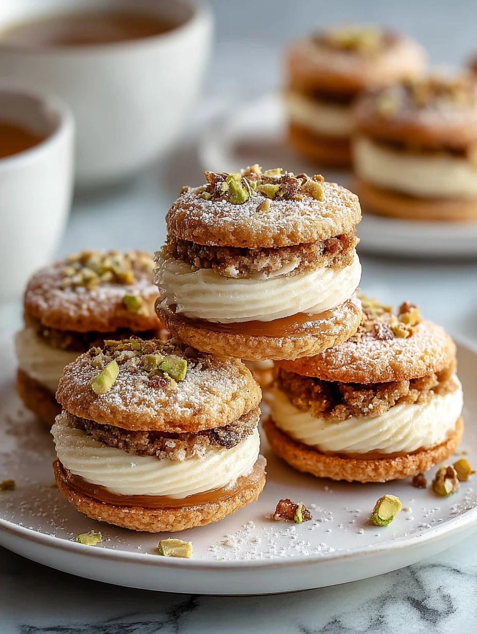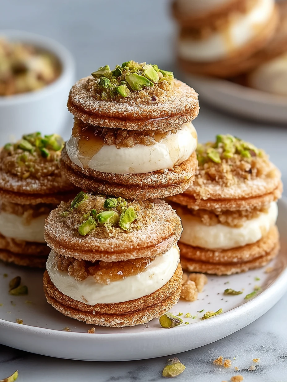 If baklava and cheesecake had a baby, it would be these stunning Baklava Cream Sandwich Cookies. Each bite offers the buttery crispness of flaky pastry cookies layered with creamy vanilla filling and nutty cinnamon-walnut paste, all drizzled with honey and topped with crushed pistachios. It’s indulgent, elegant, and the kind of treat that turns heads at parties.