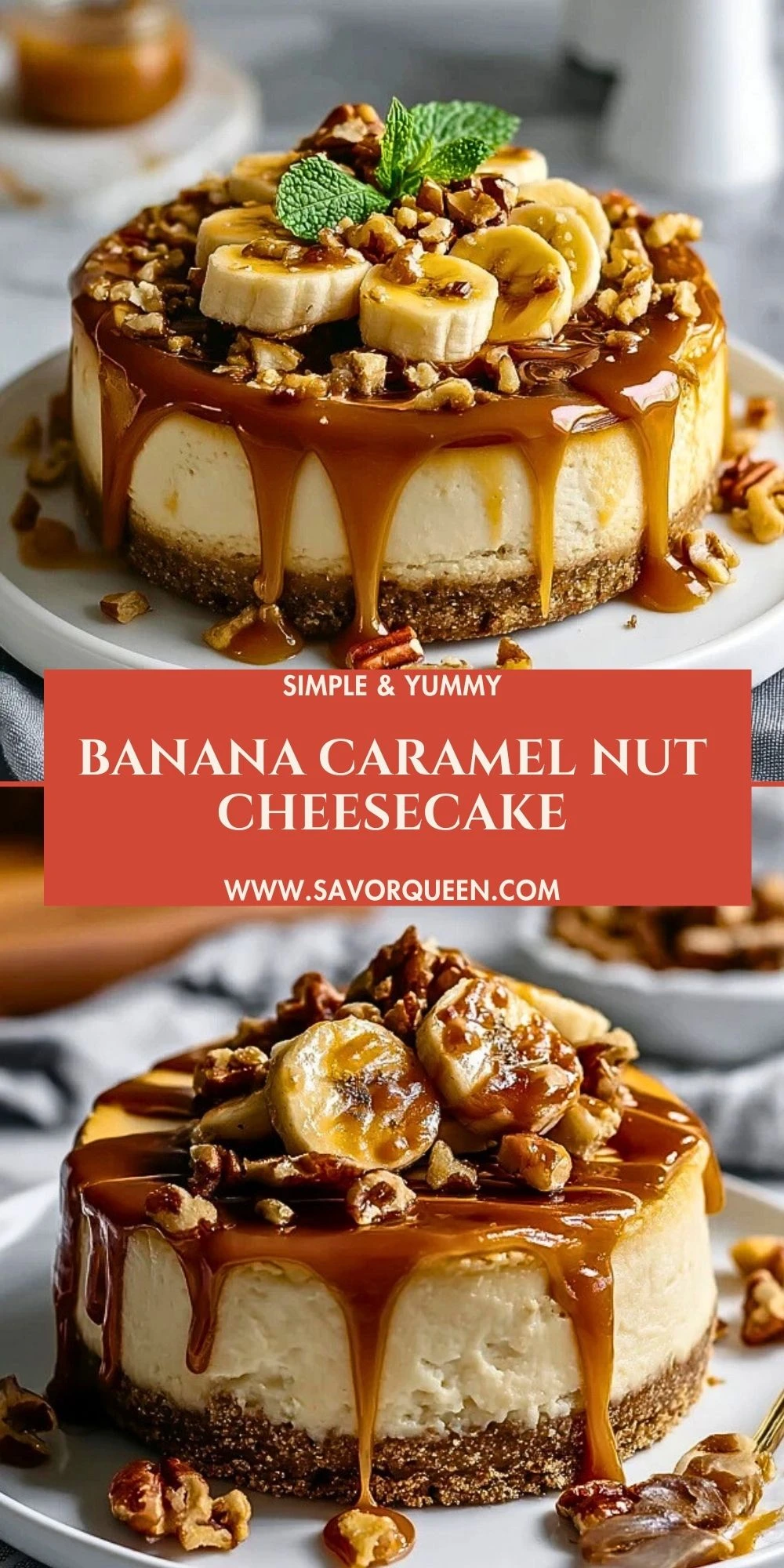 Keywords: banana caramel nut cheesecake, banana cheesecake, caramel cheesecake, baked cheesecake, easy dessert recipe, cheesecake ideas, banana dessert ideas, homemade cheesecake, holiday dessert, comfort food dessert