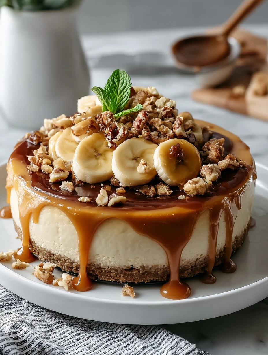 Right before serving, I spoon caramel sauce over the top, then finish with banana slices and chopped nuts. I love letting some of the caramel run over the edges because it makes the cheesecake look extra dramatic on the table.