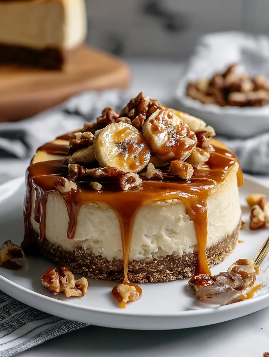 If I am making it ahead, I keep the cheesecake covered in the refrigerator for up to 4 days. I usually wait to add the banana slices until just before serving so they stay fresh and bright. If needed, I freeze the plain cheesecake without toppings, wrapped tightly, for up to 2 months. Then I thaw it overnight in the fridge and finish it with caramel, nuts, and fresh banana before bringing it to the table.