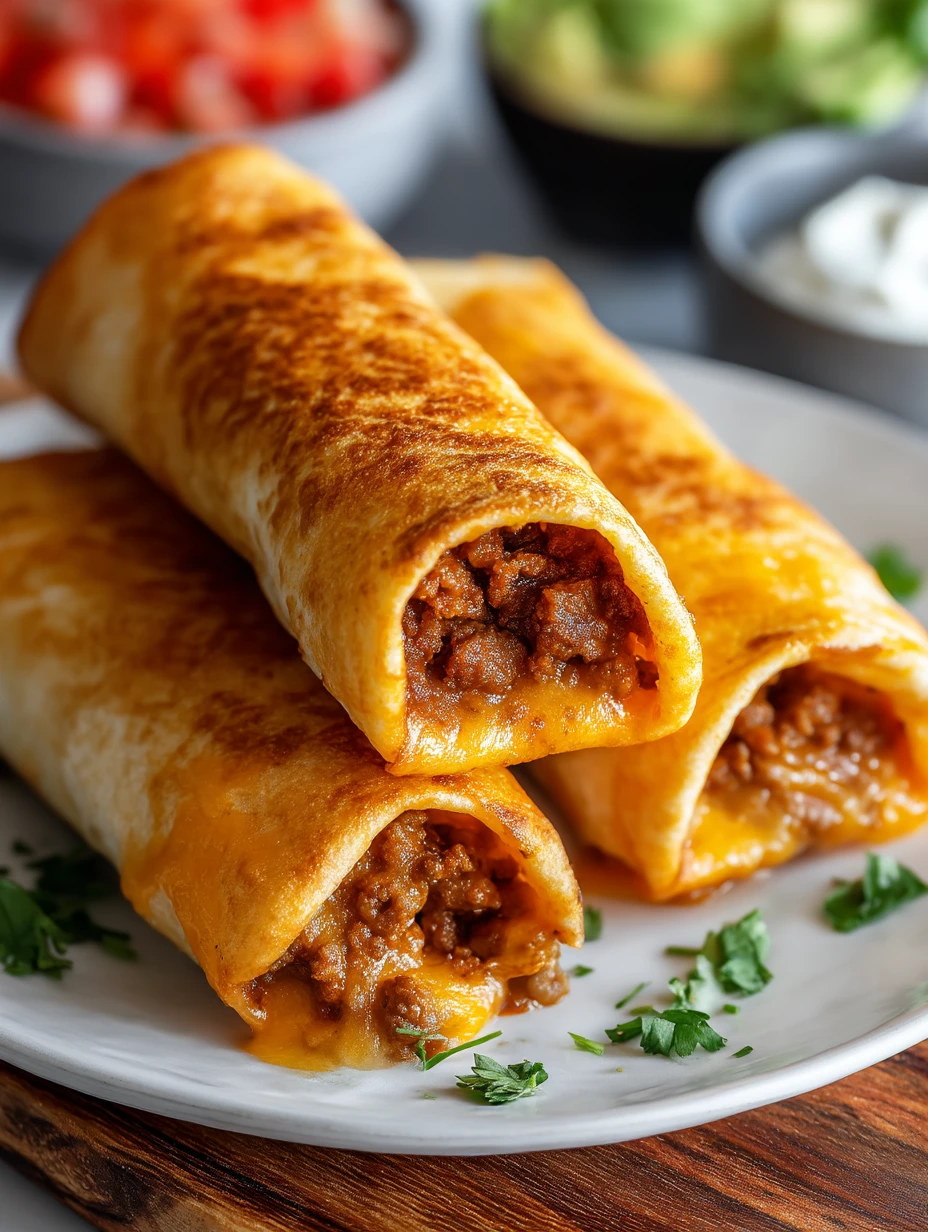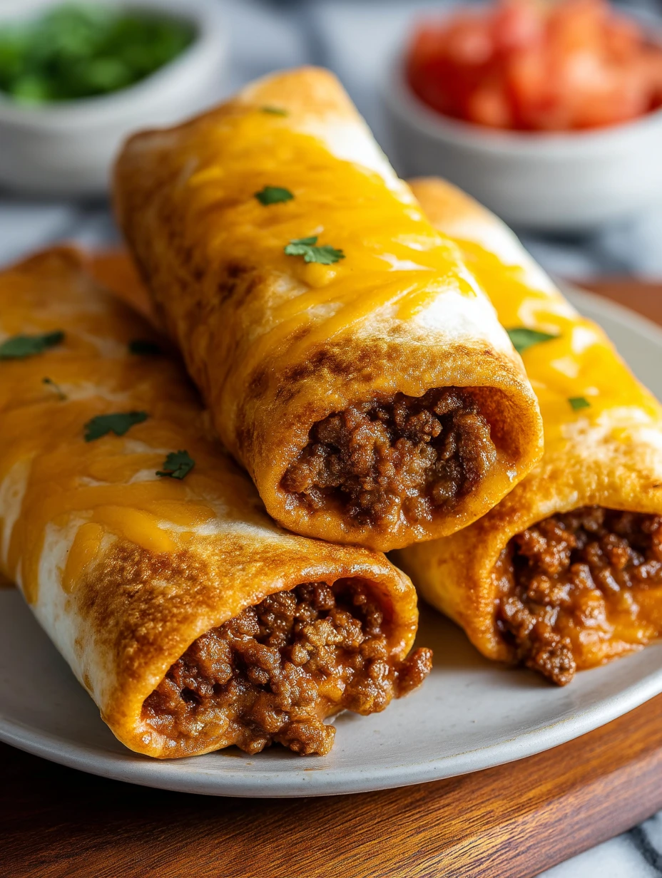 Lay a warm tortilla on a flat surface. Sprinkle a layer of shredded cheese down the center, leaving space at the edges. Spoon a generous amount of the beef mixture over the cheese, then add another light sprinkle of cheese on top. Fold the sides of the tortilla in toward the center, then roll up tightly from the bottom to form a compact bundle with the seams tucked underneath. Repeat with the remaining tortillas and filling.