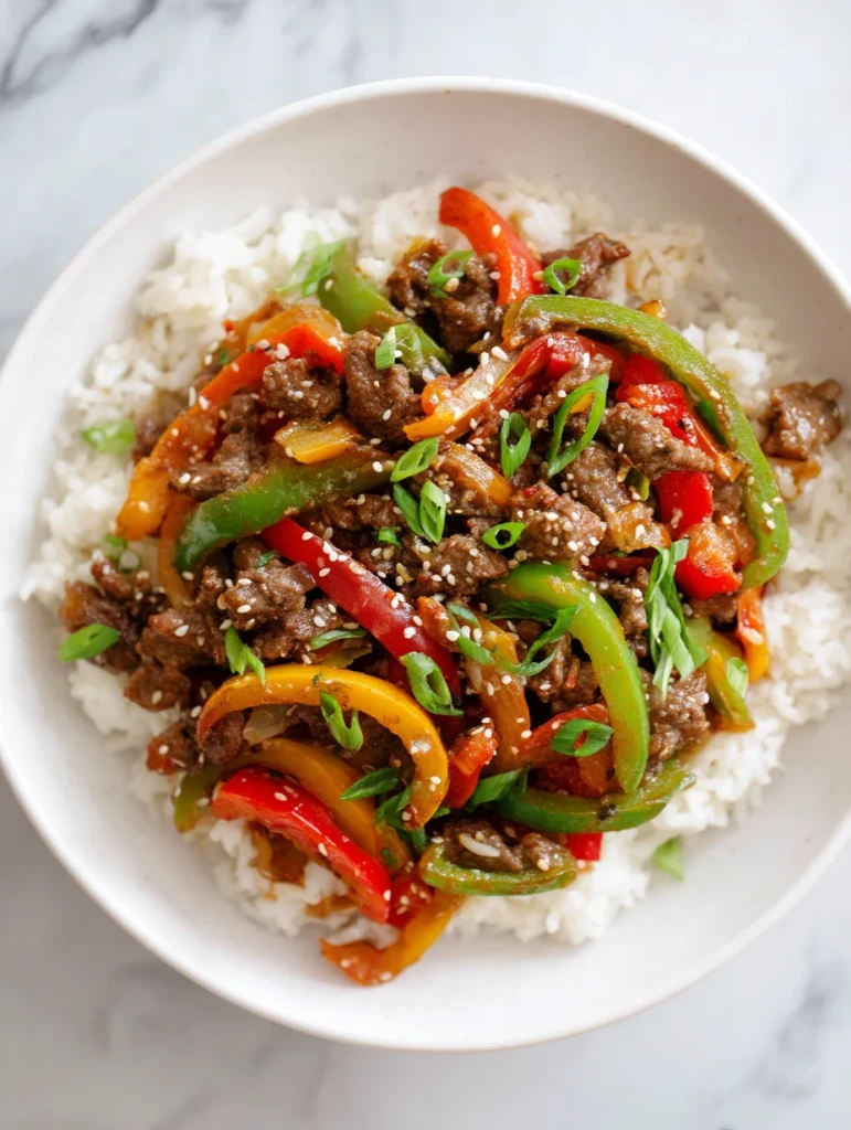 Spoon warm, fluffy rice into serving bowls. Top with generous scoops of the beef and pepper mixture. Garnish with green onions or sesame seeds if desired.