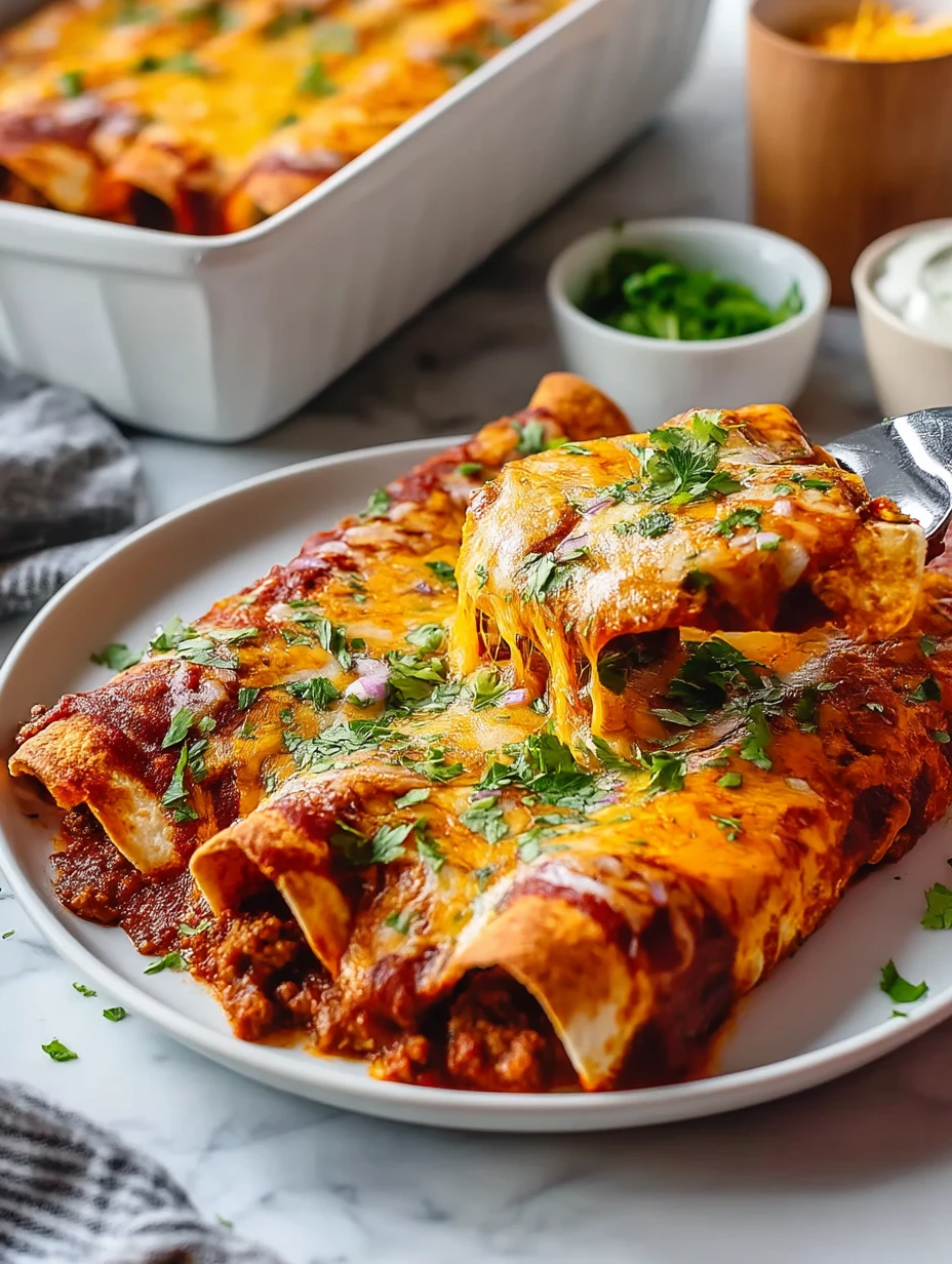 Beef enchiladas are best served hot from the oven when the cheese is still perfectly melted and the sauce is bubbling. Let the dish cool for about 5–10 minutes so the enchiladas hold their shape when you scoop them out. A generous spoonful of extra sauce from the pan over each serving ensures every bite is moist and flavorful.