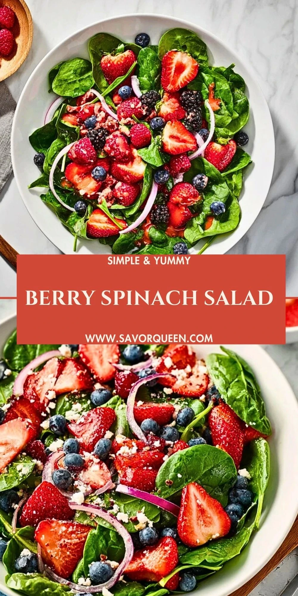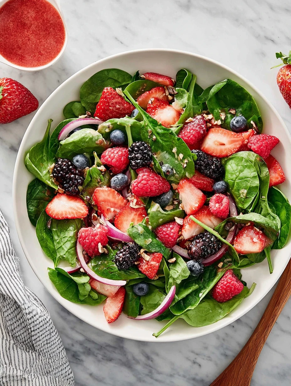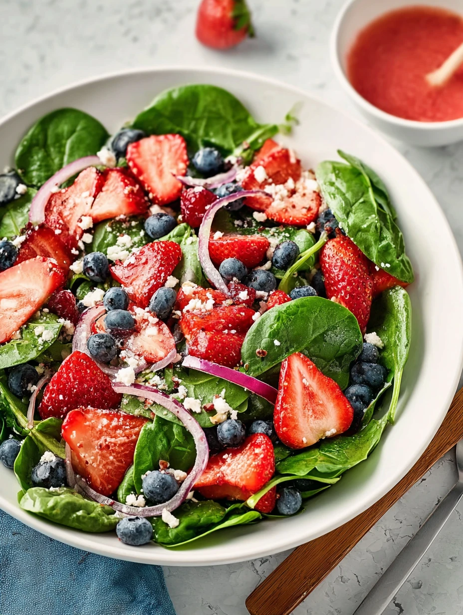 Looking for a vibrant, flavor-packed salad that screams summer freshness? This Berry Spinach Salad combines baby spinach, juicy strawberries, blueberries, raspberries, creamy goat cheese, red onion, and toasted pecans, all drizzled with a homemade strawberry vinaigrette. It’s refreshing, light, and full of bold textures—perfect for a quick lunch, brunch centerpiece, or as a side for grilled meats. Whether you’re into healthy snacks, light lunch ideas, or easy dinner sides, this colorful bowl delivers serious flavor with very little prep. It’s the perfect choice for warm weather food ideas or any day you want a pop of color on your plate.