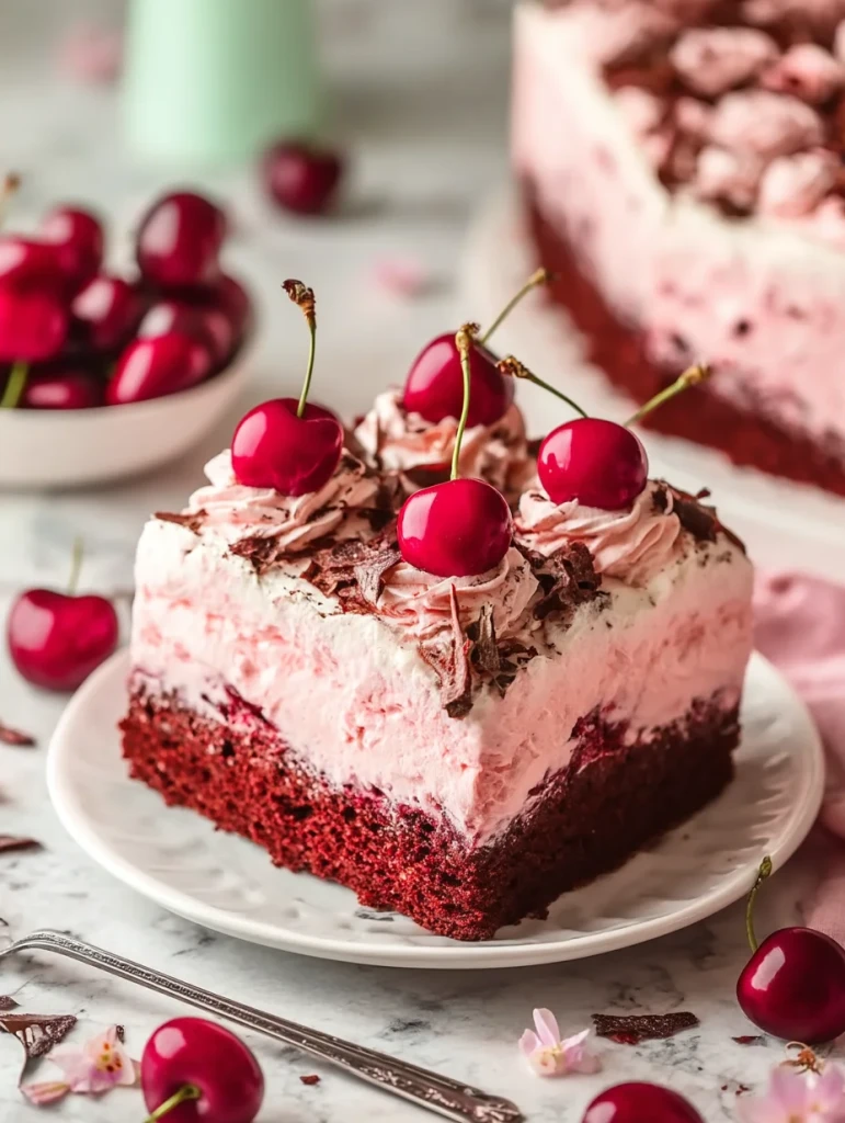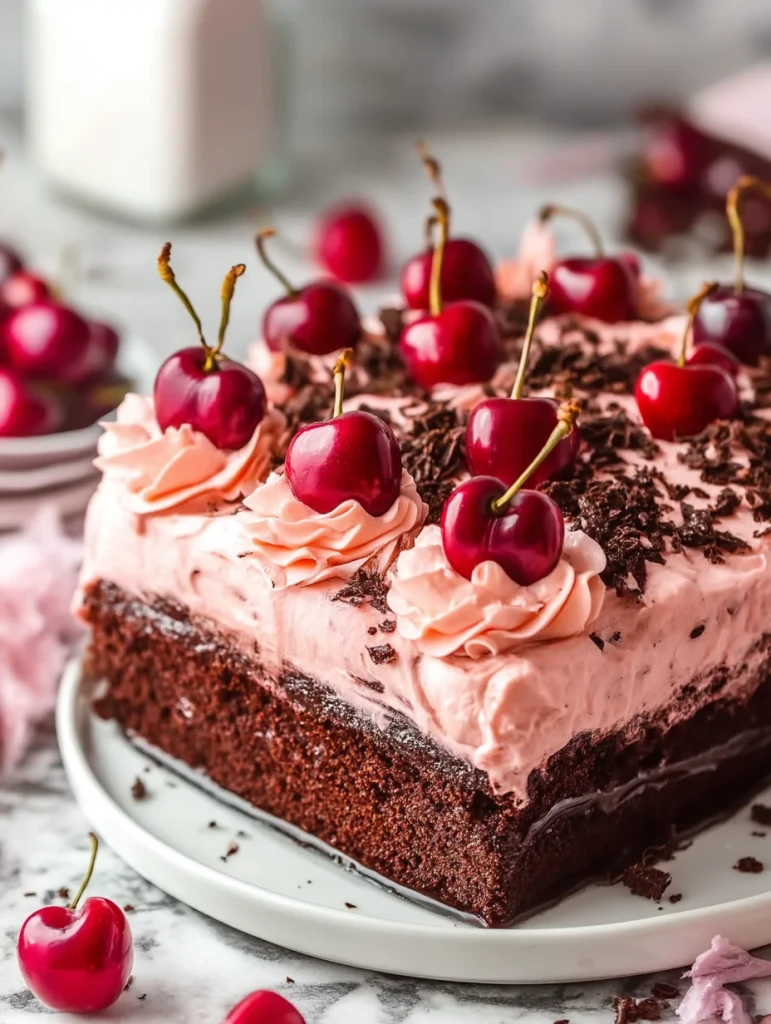 Moist chocolate cake meets bubbly cherry bliss in this decadent dessert that feels like a party in every slice. Topped with a whipped cherry frosting, bursts of maraschino cherries, and a surprise chocolate crunch hidden in every bite, this treat is anything but ordinary.