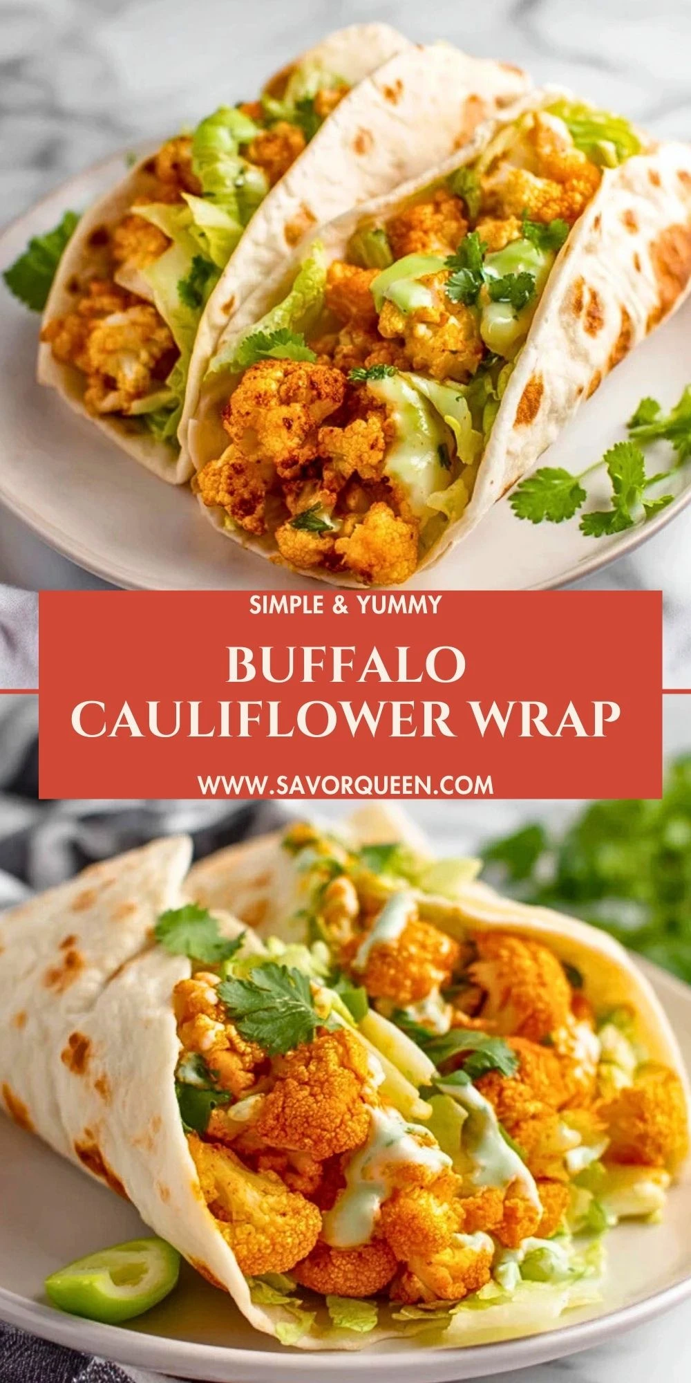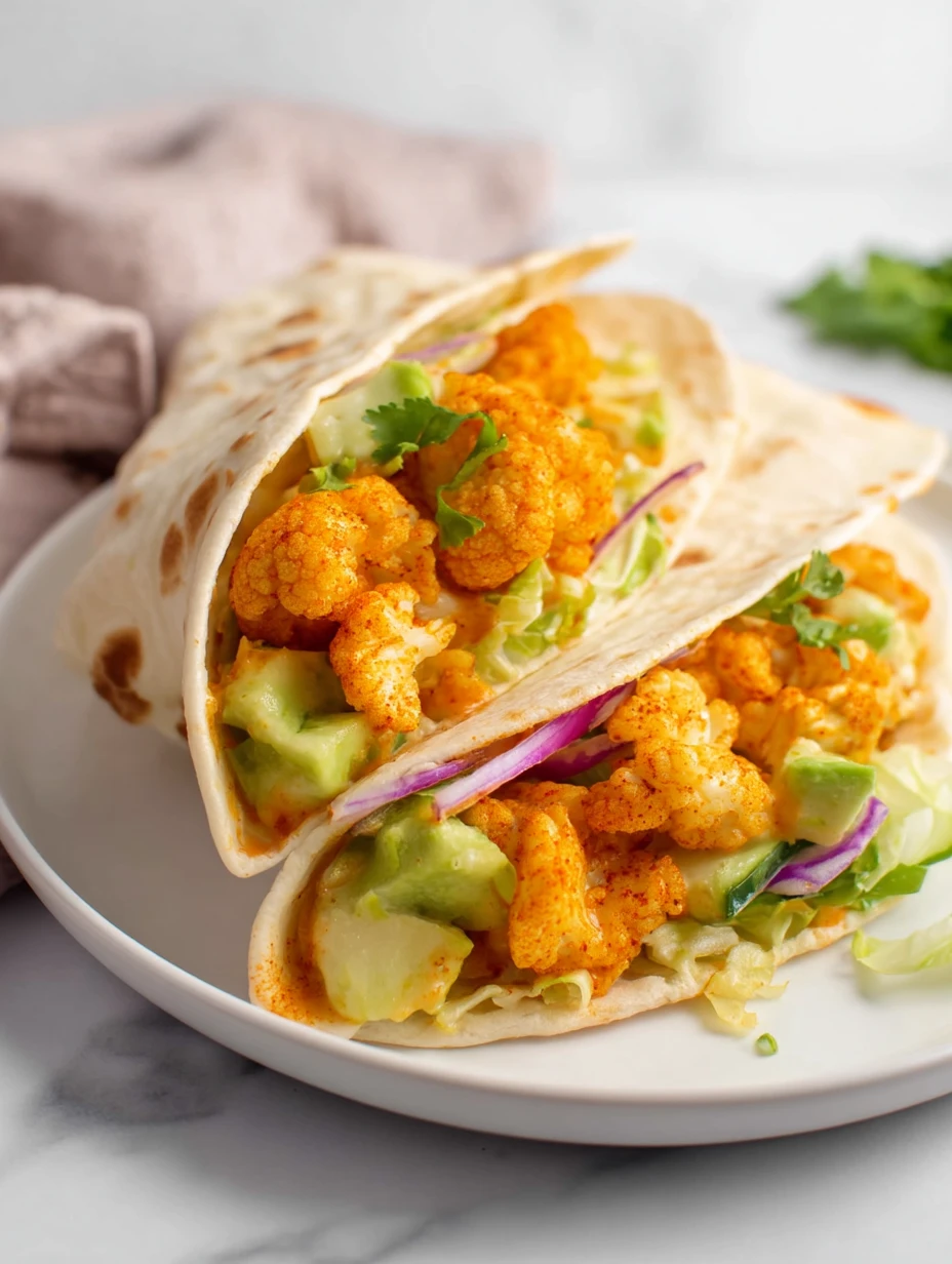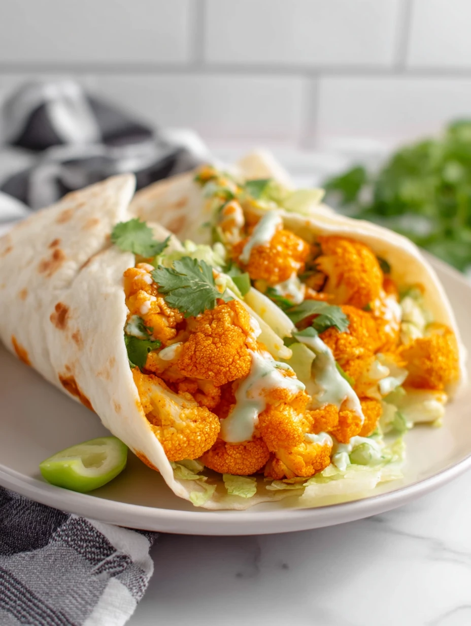 Keywords: buffalo cauliflower wrap, healthy lunch, vegetarian wraps, meatless dinner, spicy tortilla wraps