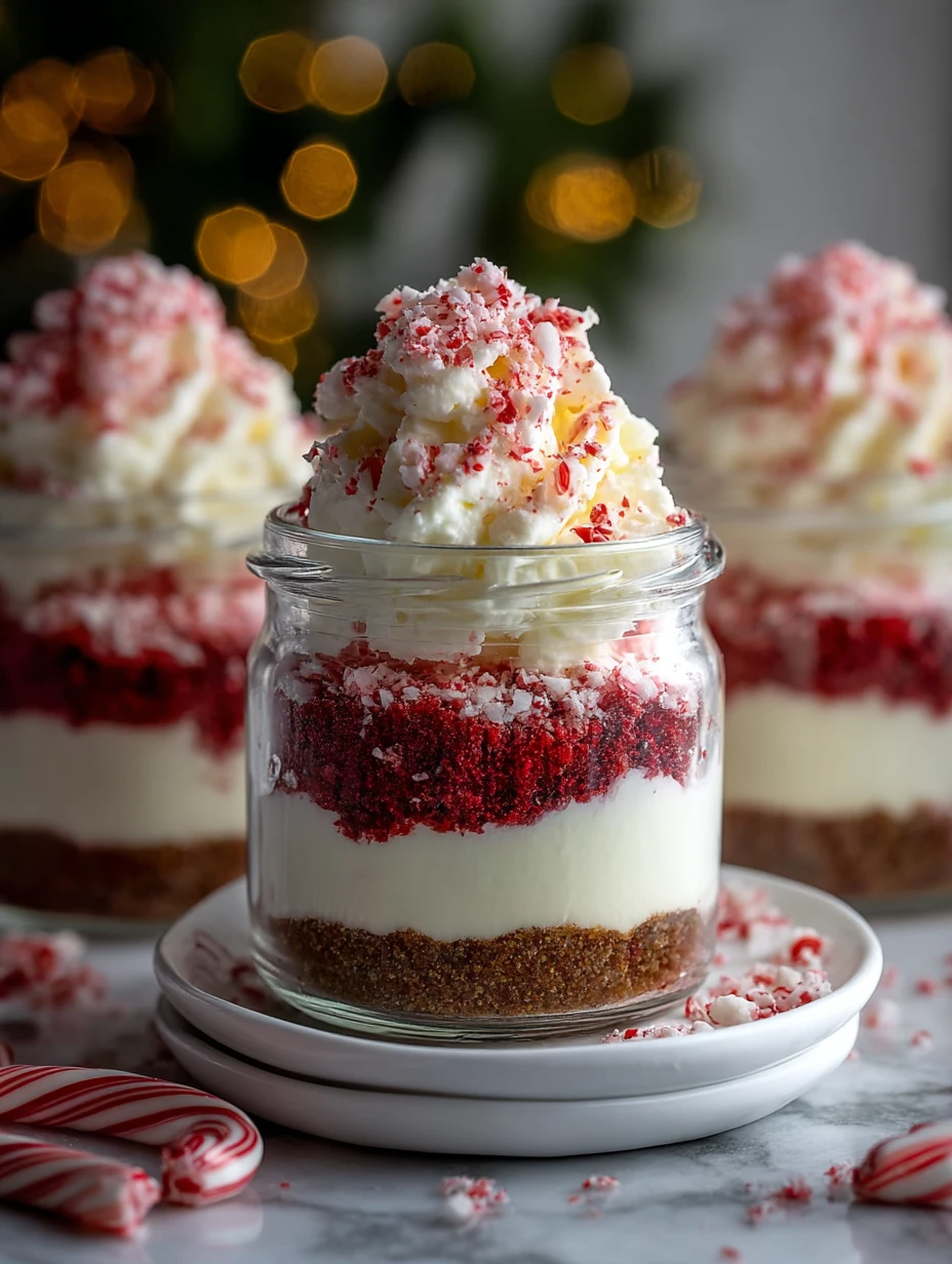 While traditional cheesecake sits on a graham cracker crust, these parfaits go all-in with red velvet cake layers for color and flavor. You can bake a red velvet cake from scratch, use a boxed mix, or even repurpose leftover cake. The vibrant red crumb adds a bold visual contrast to the creamy filling and the peppermint topping. Want a twist? Chocolate cake or brownie crumbles would also work wonderfully.