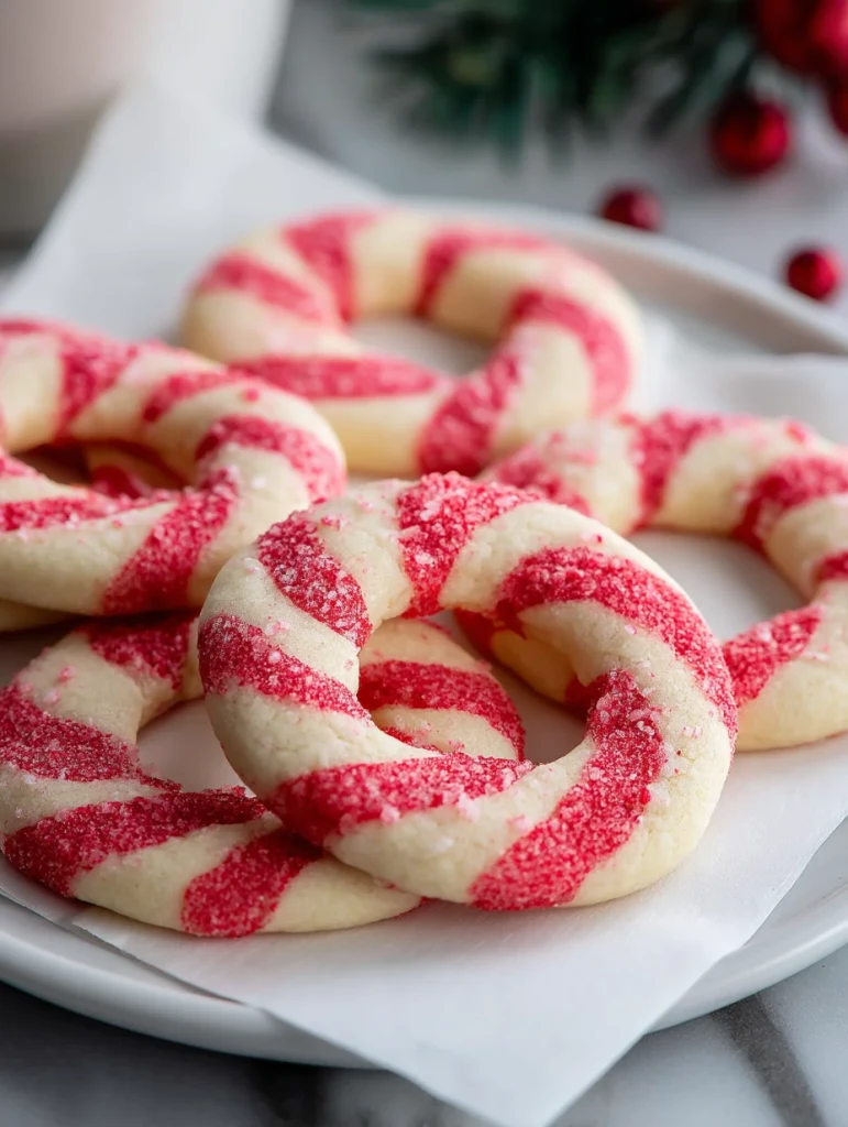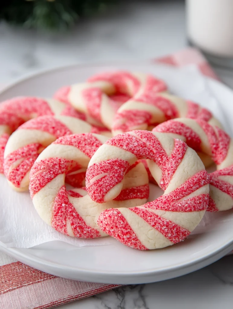 The contrast of red and white stripes, dusted in sparkling sugar, makes them look like edible peppermint swirls—but without the mint. Instead, they’re buttery, soft, and lightly sweet, making them the kind of treat you’ll want with a mug of cocoa or nestled among your favorite Christmas desserts.