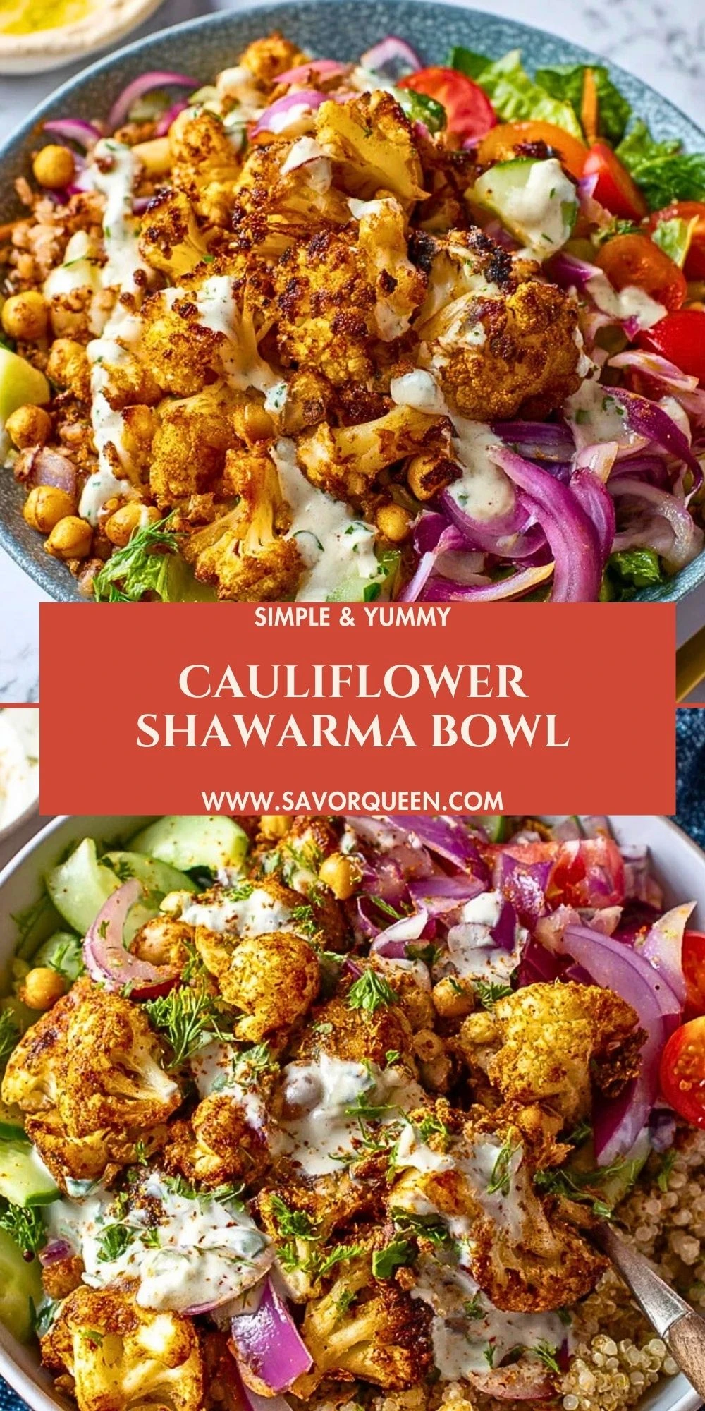 Craving a flavorful plant-based dinner idea? This Cauliflower Shawarma Bowl is here to satisfy! Roasted spiced cauliflower meets crispy chickpeas, fresh cucumber-tomato salad, fluffy quinoa, and a creamy tahini sauce for a bold, nourishing bowl packed with vibrant flavor and texture. Perfect for quick dinners, easy meal prep, or healthy lunch ideas. Whether you’re looking for a gluten-free meal, meatless Monday inspiration, or just a comforting bowl of food, this easy recipe checks every box.