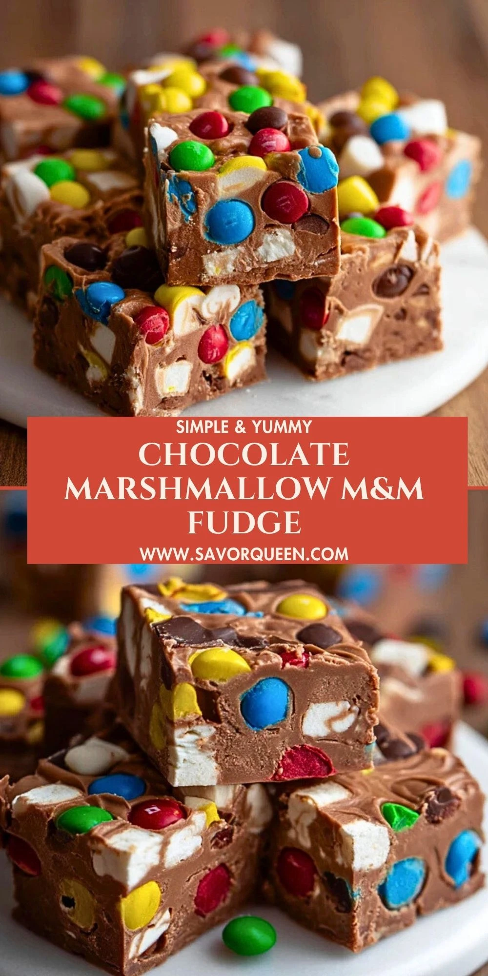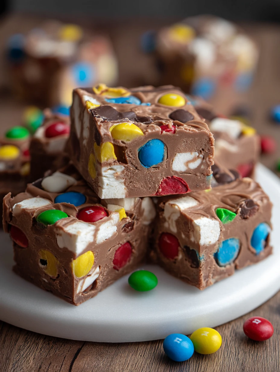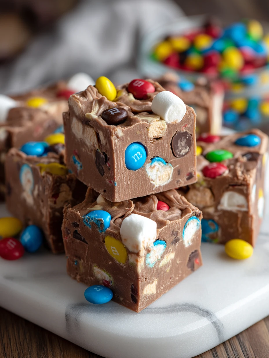 Keywords: fudge, M&M dessert, no-bake chocolate recipe, marshmallow fudge, easy treat