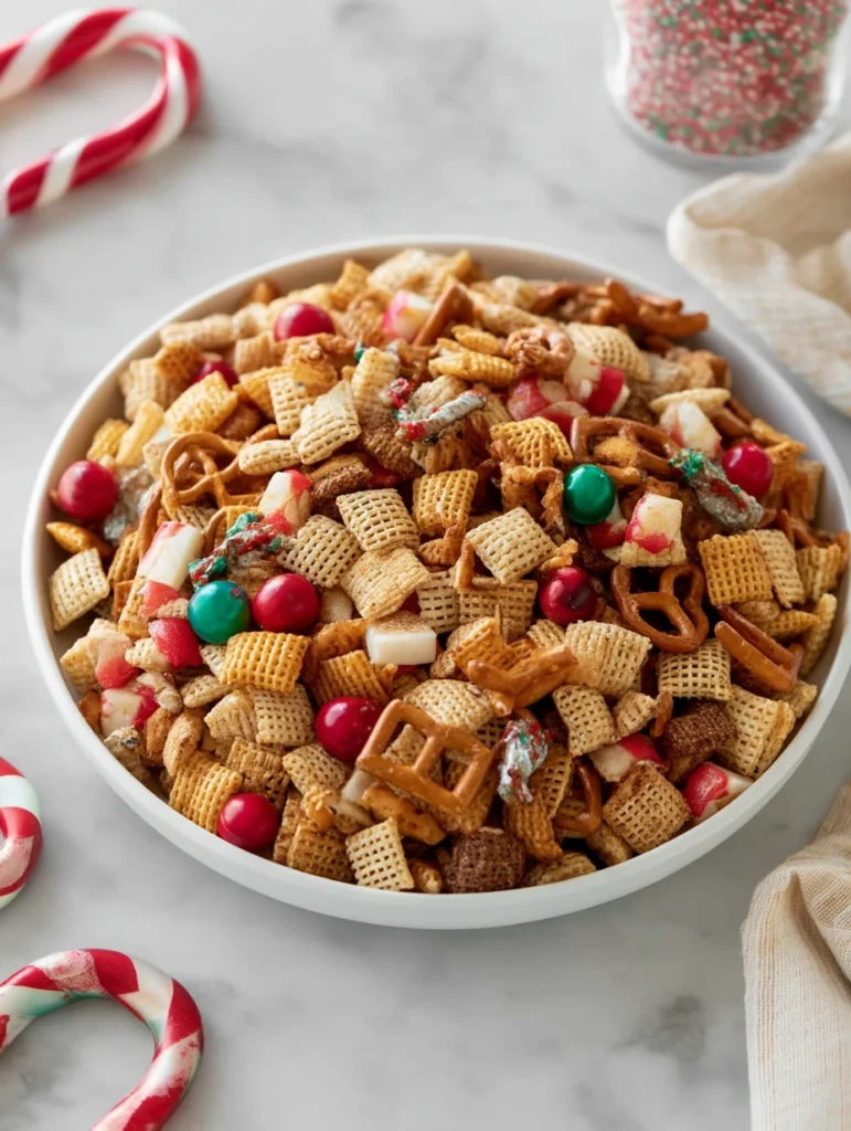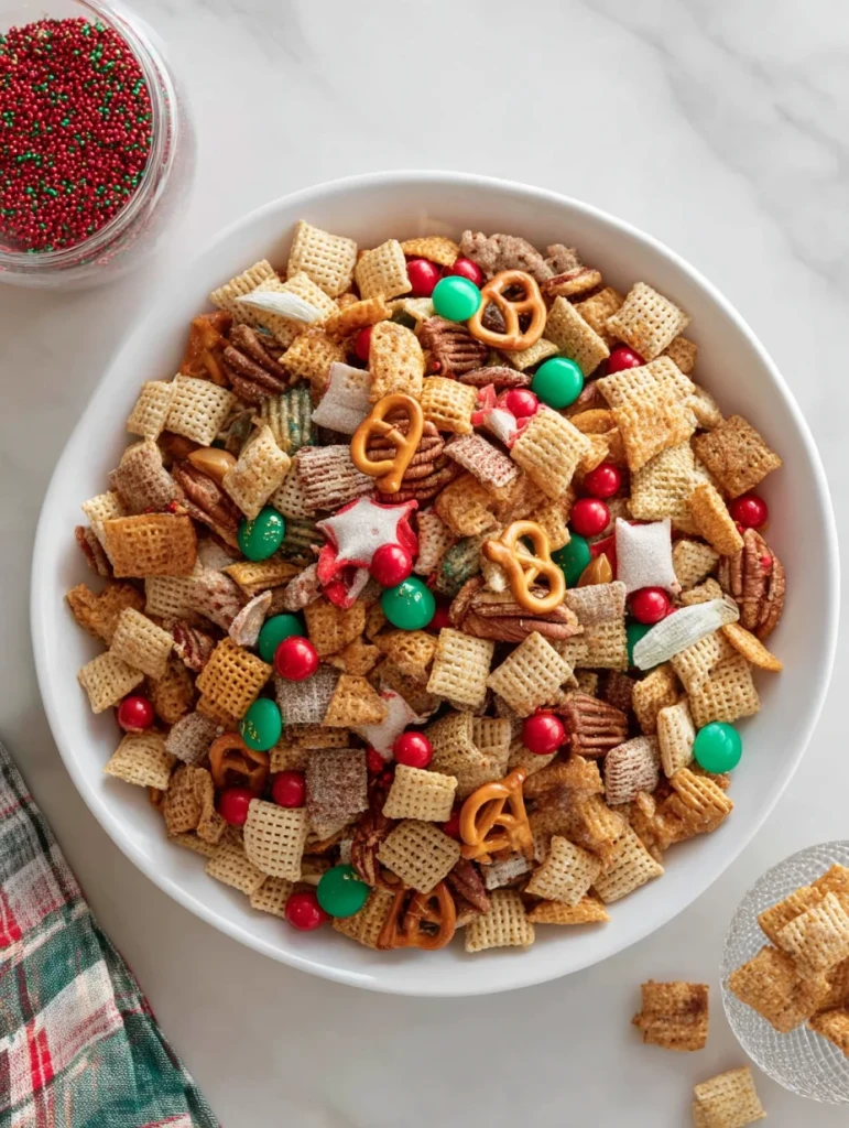 What makes this Chex mix so irresistible? It combines classic cereal crunch with a caramel glaze that hardens into a light crackle, plus peanuts, pretzels, M&M’s, and holiday sprinkles to keep things exciting. Whether you’re filling your snack bowls or your holiday tins, this mix is about to be your new seasonal go-to.