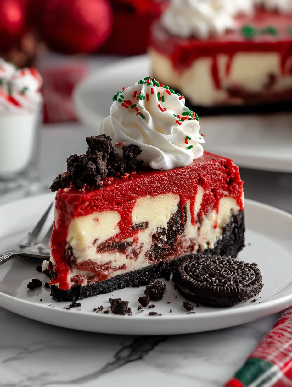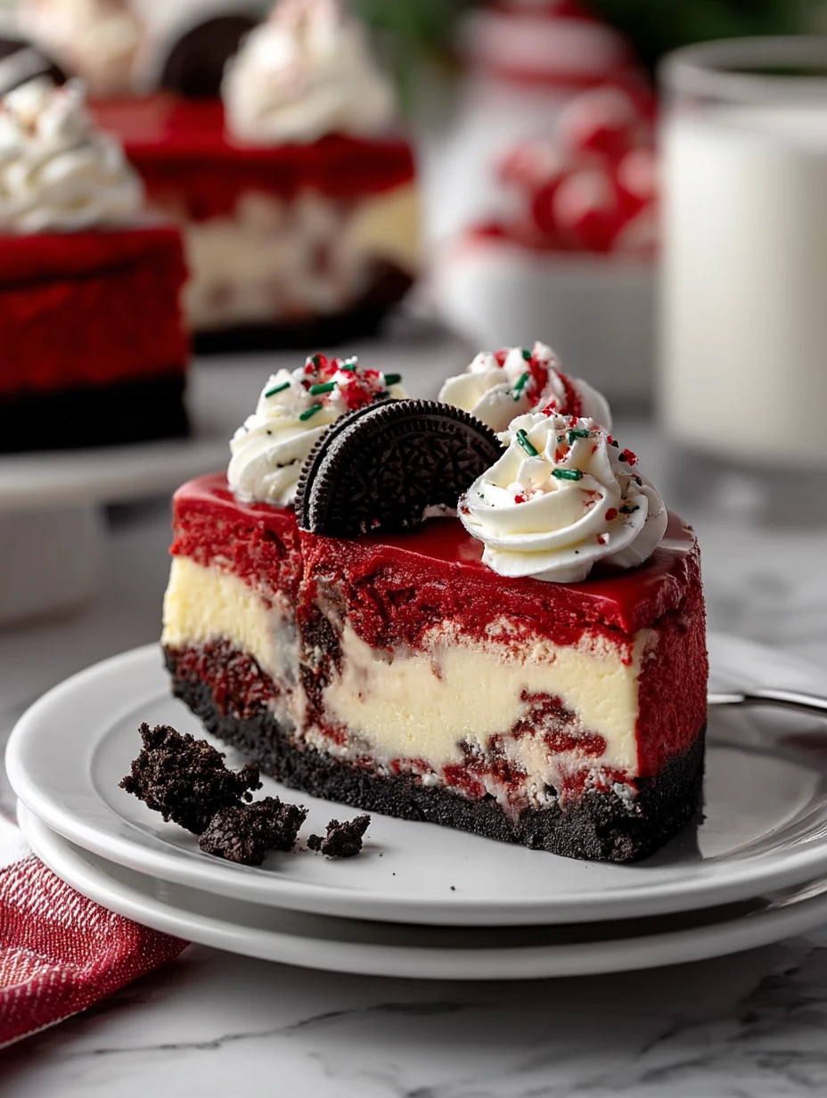Keywords: Christmas cheesecake, red velvet cheesecake, Oreo crust dessert