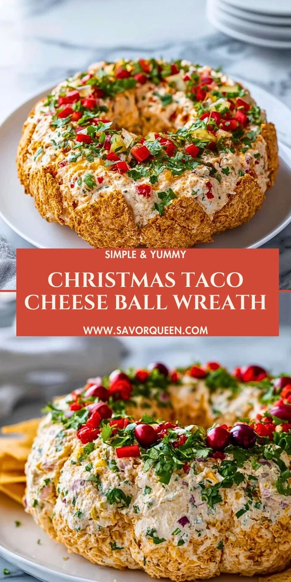 Keywords: taco cheese ball, holiday appetizer, party dip, cheese ball wreath, Christmas appetizer