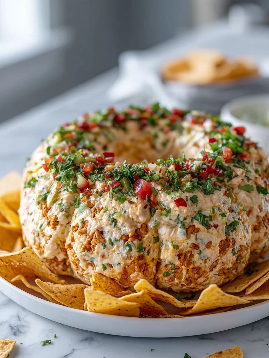Before serving, top the wreath with chopped tomatoes, additional green onions, cilantro, and a sprinkle of paprika or chili powder for that festive red-and-green finish.