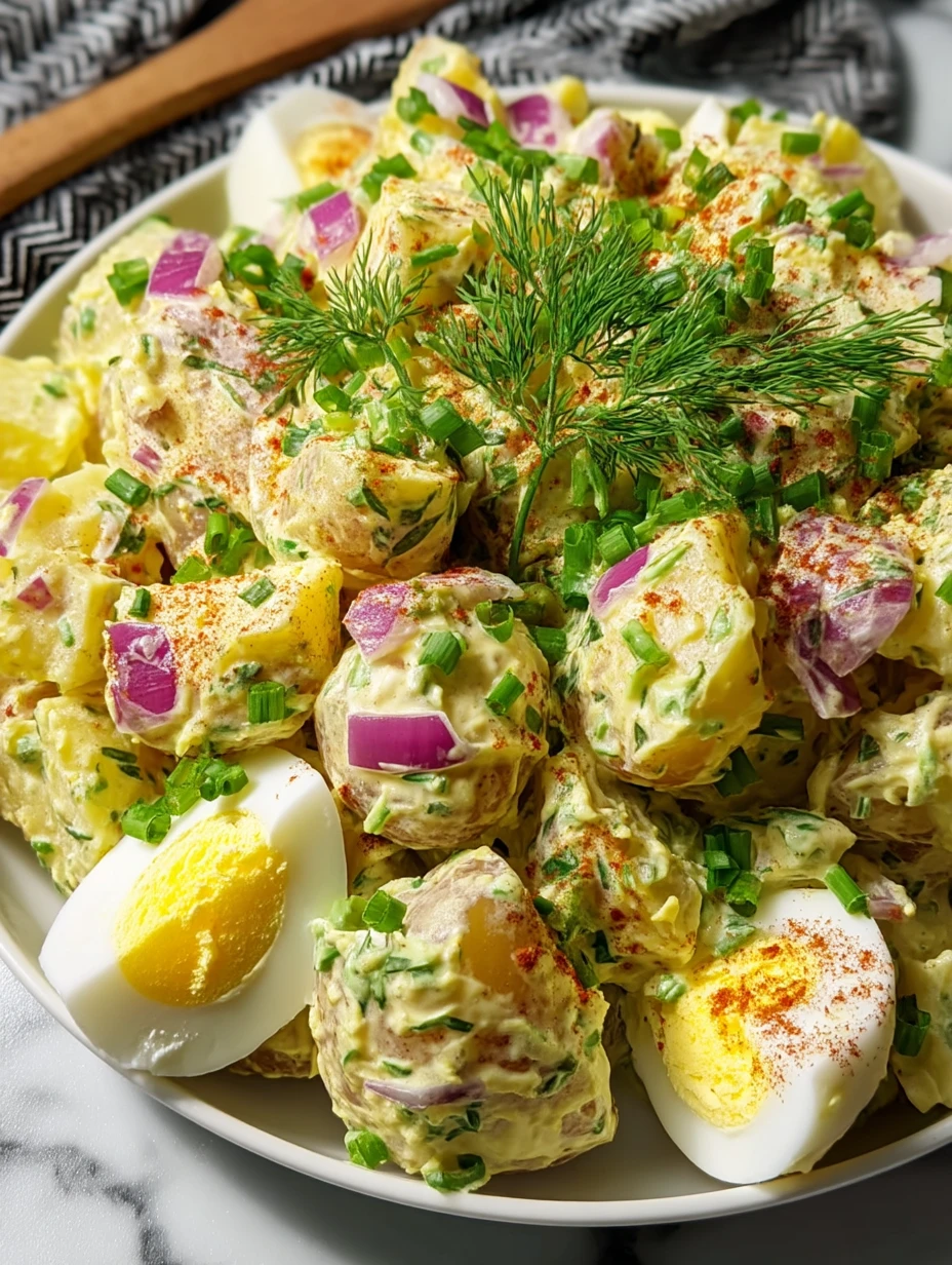 What makes this salad stand out is its balance of rich mayonnaise with a hint of tangy mustard, and just the right crunch from red onions and celery. A touch of paprika, fresh dill, and perfectly boiled eggs give this dish its iconic flair. Whether it’s nestled next to grilled burgers or served solo, this recipe is pure backyard bliss.