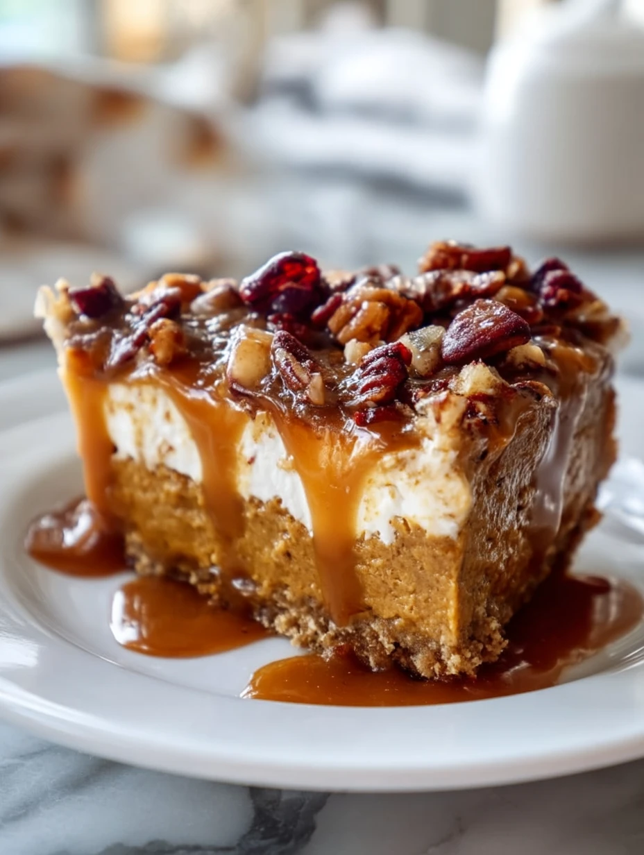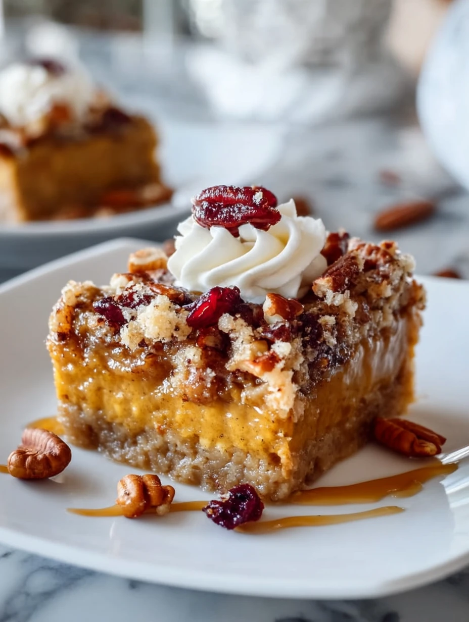 The top layer is studded with vibrant cranberries and toasted pecans, giving a satisfying crunch to every soft, buttery bite. A drizzle of maple syrup or caramel sauce ties it all together. Whether you’re entertaining guests or just spoiling yourself, this dessert delivers that nostalgic holiday hug we all crave.