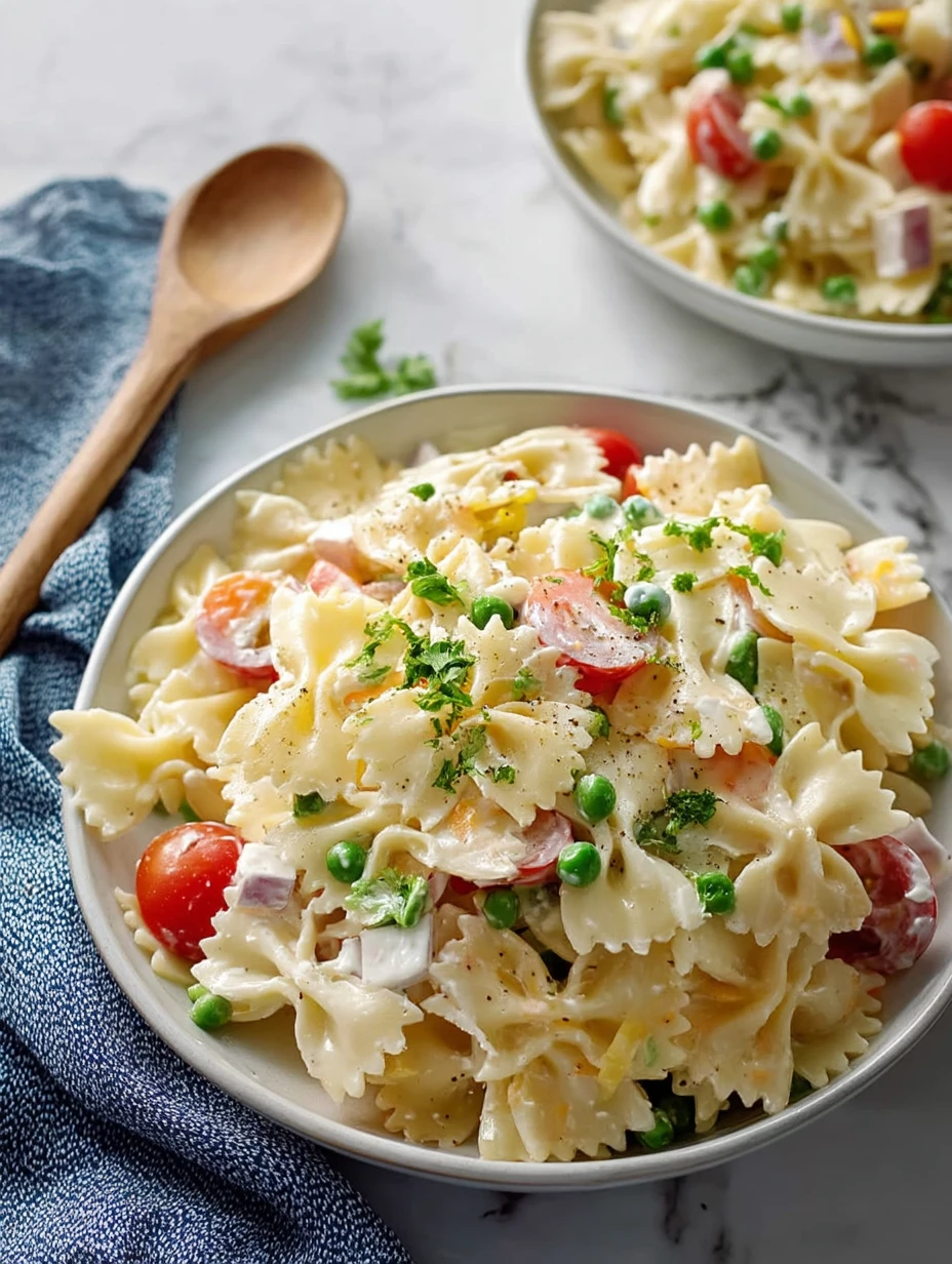 Keywords: creamy bow tie pasta salad, pasta salad, easy pasta salad, summer side dish, picnic food, potluck recipe, quick lunch, easy dinner side, chilled salad, food ideas