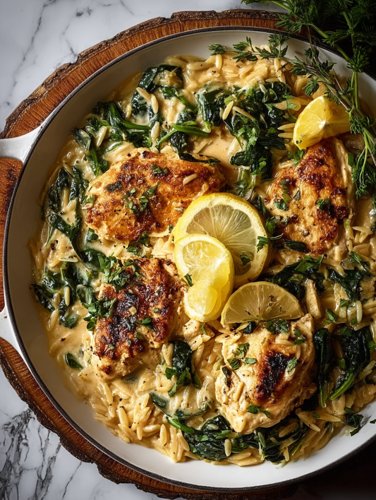 Skillet comfort meets zesty freshness in this Creamy Lemon Chicken with Orzo & Greens. Juicy pan-seared chicken thighs nestle into a bed of creamy orzo, flavored with garlic, lemon, and tender spinach. It’s an easy recipe that feels both elegant and effortless — ideal for weeknights or casual entertaining. Whether you’re craving a quick dinner idea or wholesome food inspiration, this one-pan meal delivers big flavor with minimal cleanup. Try it as a healthy snack alternative, a cozy lunch, or as part of your go-to dinner ideas rotation.