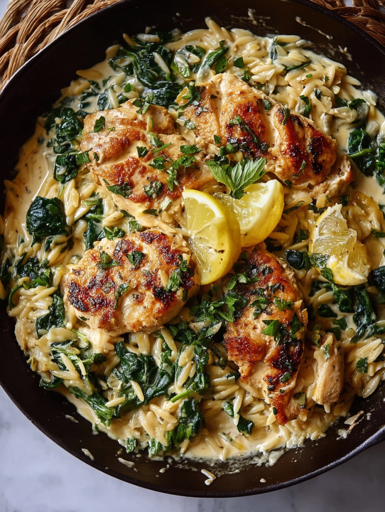 Keywords: creamy chicken, easy dinner, orzo recipe, one-pan meal, lemon chicken