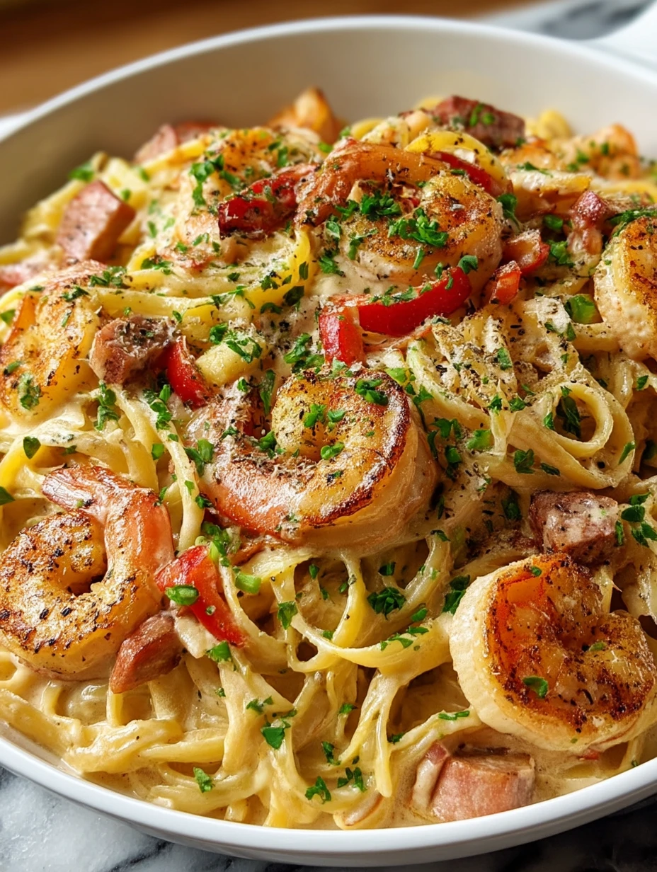 Fettuccine is a great choice for this dish because it stands up well to the creamy sauce and hearty proteins. You could also substitute linguine or penne if preferred. The key is using pasta with enough surface area to hold onto that luscious Cajun Alfredo sauce.