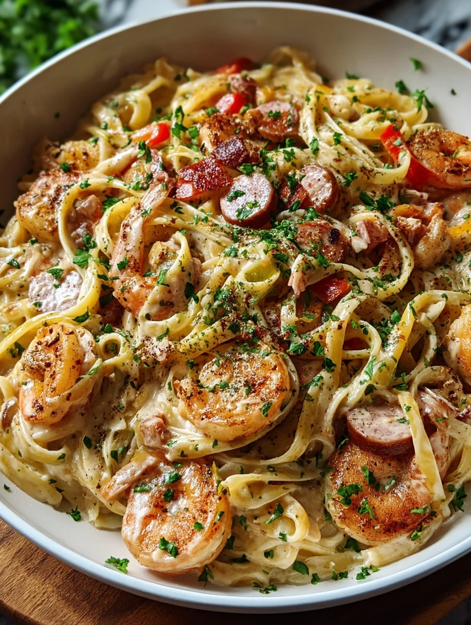 Return the chicken, sausage, and shrimp to the skillet. Add cooked fettuccine and toss everything to coat evenly in the sauce. Let it all heat through, then garnish with parsley and cracked black pepper.