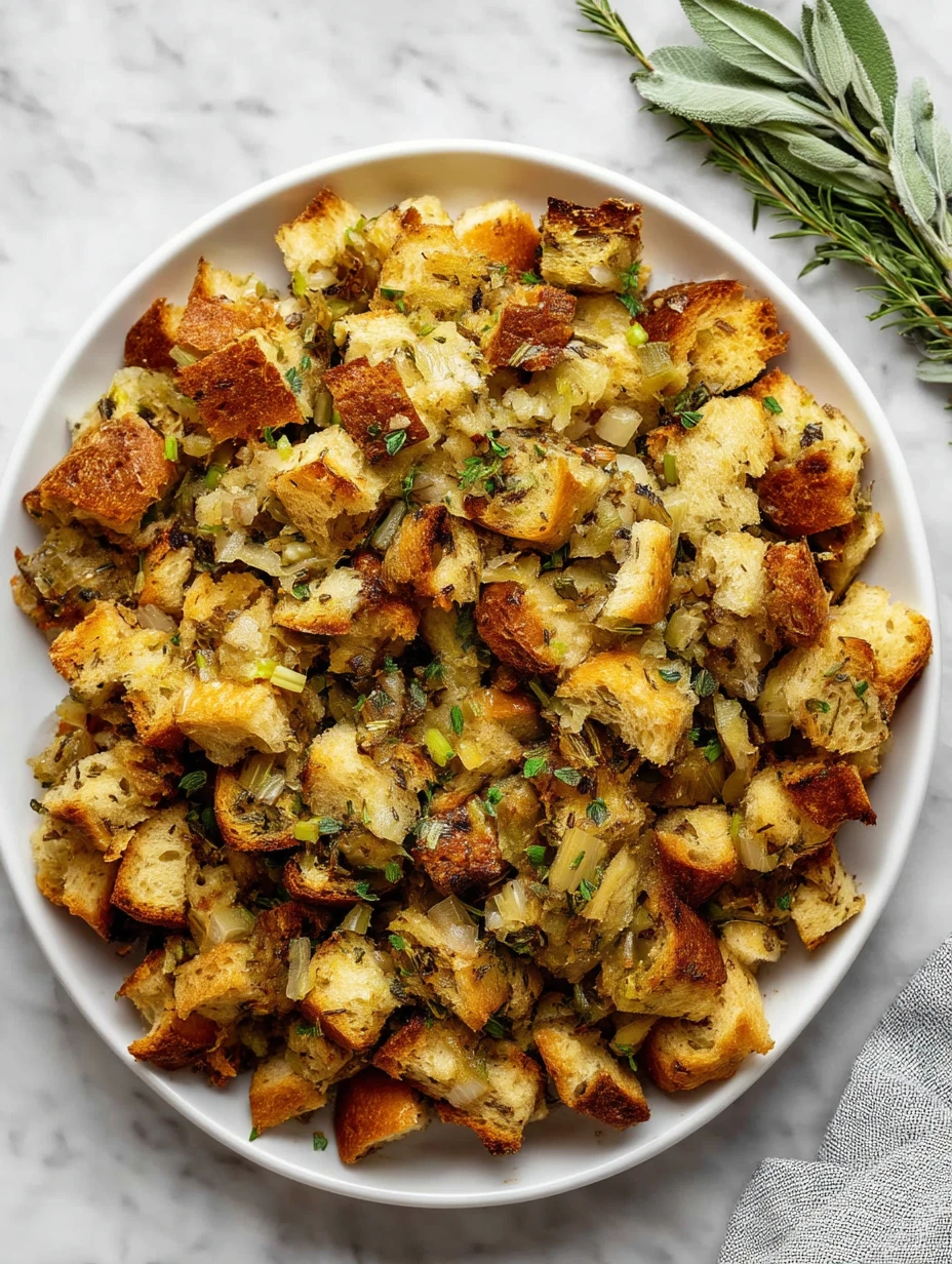 Serve your stuffing hot, straight from the oven, garnished with extra fresh herbs if you like. It pairs perfectly with roast turkey, ham, or even roasted vegetables.
