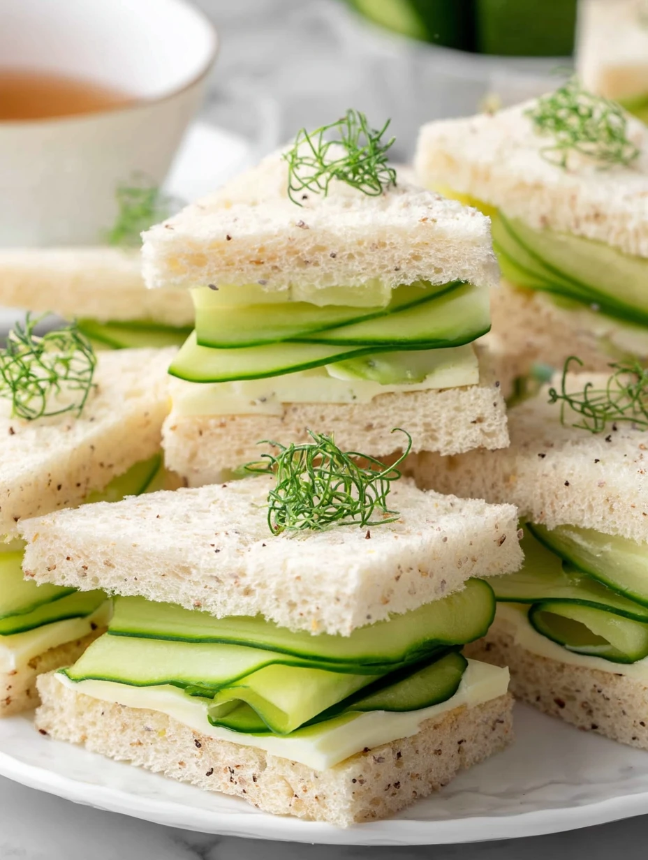 Cucumber tea sandwiches are best enjoyed fresh to maintain their crisp texture and bright flavor. If you need to prepare them ahead, wrap them tightly with plastic wrap and store them in the refrigerator for up to 24 hours. To prevent sogginess, make sure the cucumbers are well-dried before assembly.
