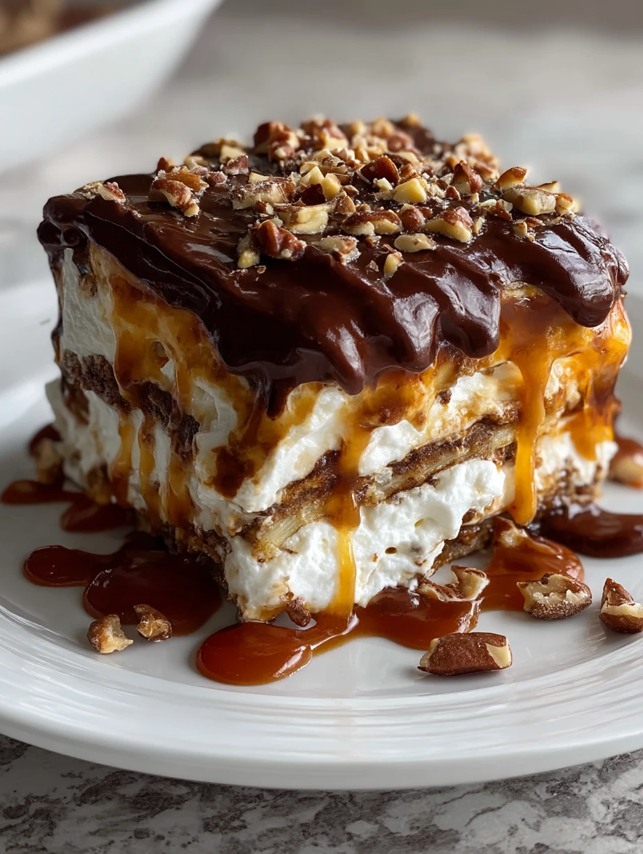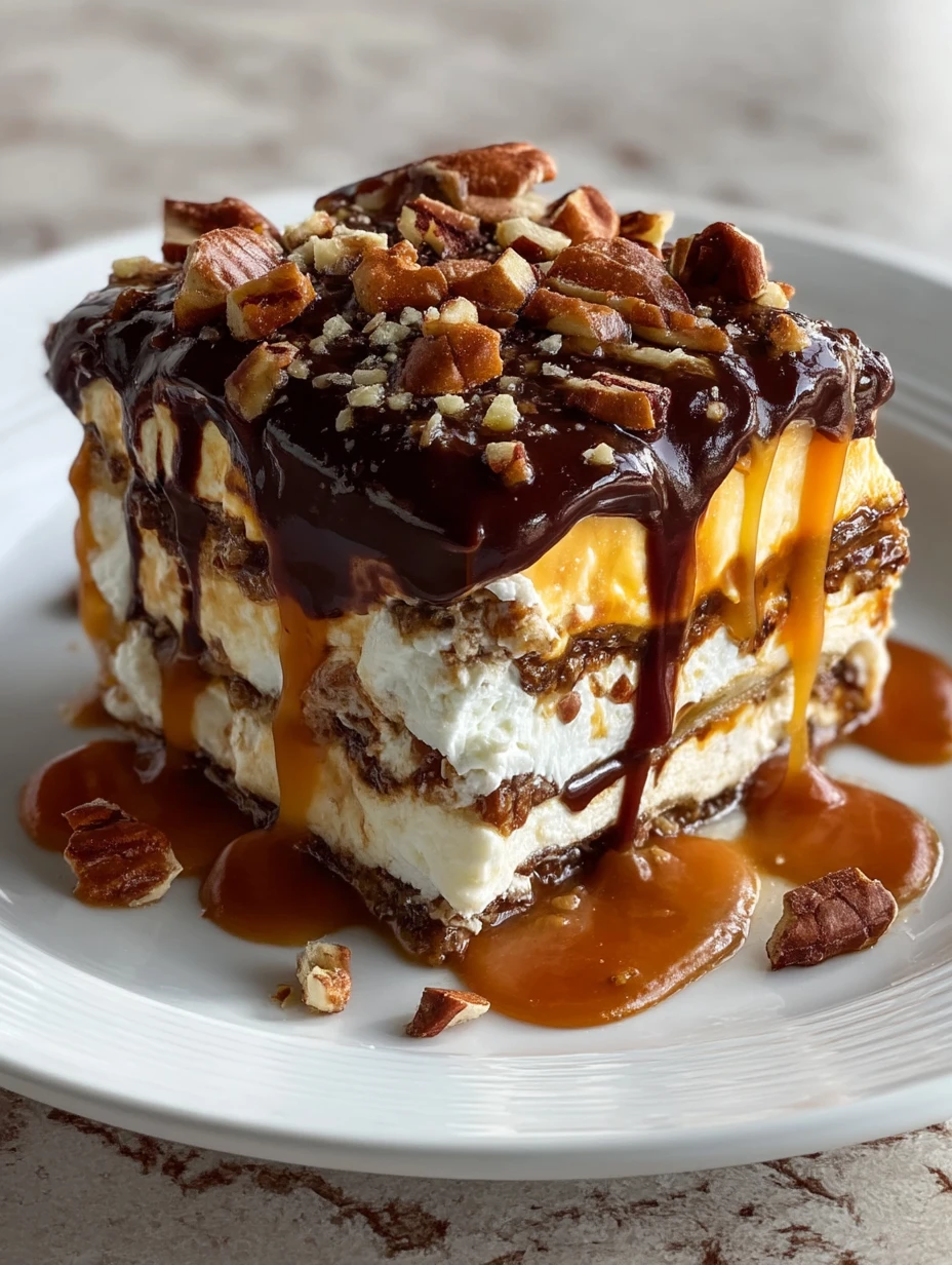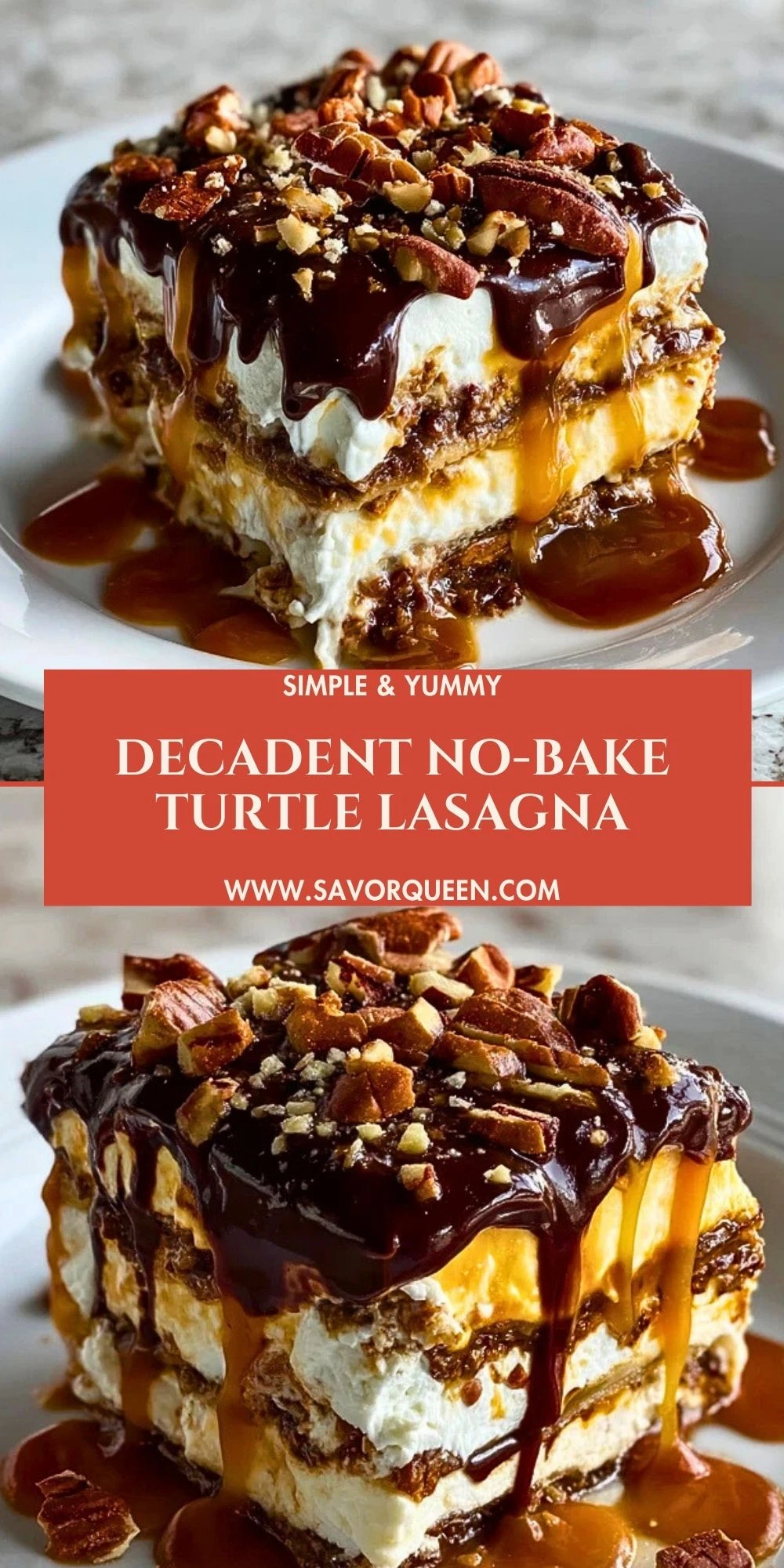 Decadent No-Bake Turtle Lasagna is a rich layered dessert with soft graham cracker “noodles,” fluffy whipped cheesecake filling, glossy chocolate ganache, and ribbons of caramel and toasted pecans in every bite. This easy recipe is perfect when you want a show-stopping sweet without turning on the oven—ideal for make-ahead entertaining, potlucks, holiday dessert tables, or anytime you’re craving indulgent dessert ideas that still feel effortless. It’s a stunning easy recipe for anyone who loves chocolate, caramel, and pecans and wants new food ideas for celebrations, parties, or just a seriously luxurious treat.