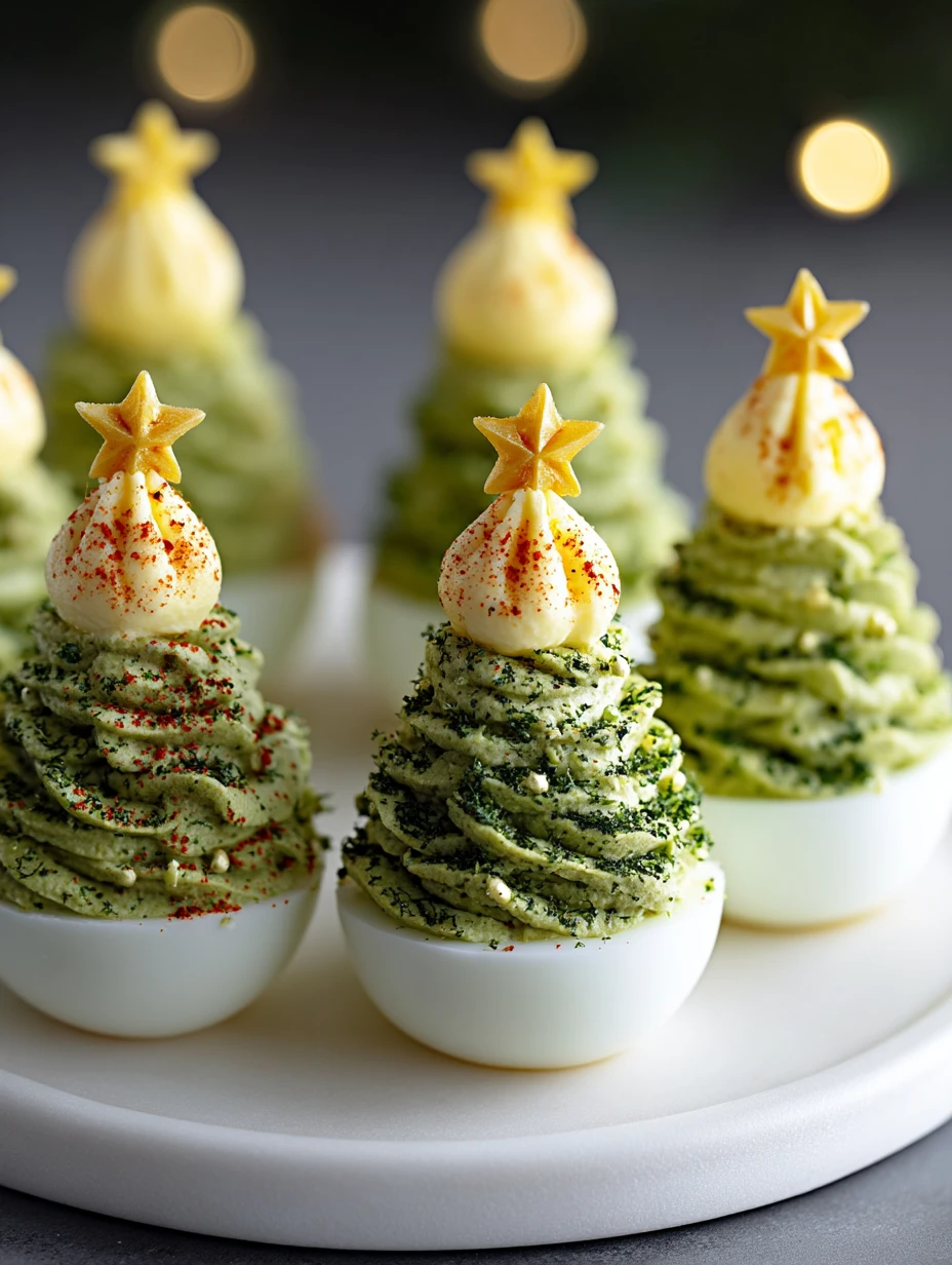 The secret is in the filling. By combining egg yolks with avocado, you get both a creamy texture and that signature green tree look without artificial food coloring. A piping bag with a star tip helps shape the “branches,” and a dash of paprika adds holiday sparkle. The finishing touch? A cherry tomato slice or edible red bell pepper cut into a star!