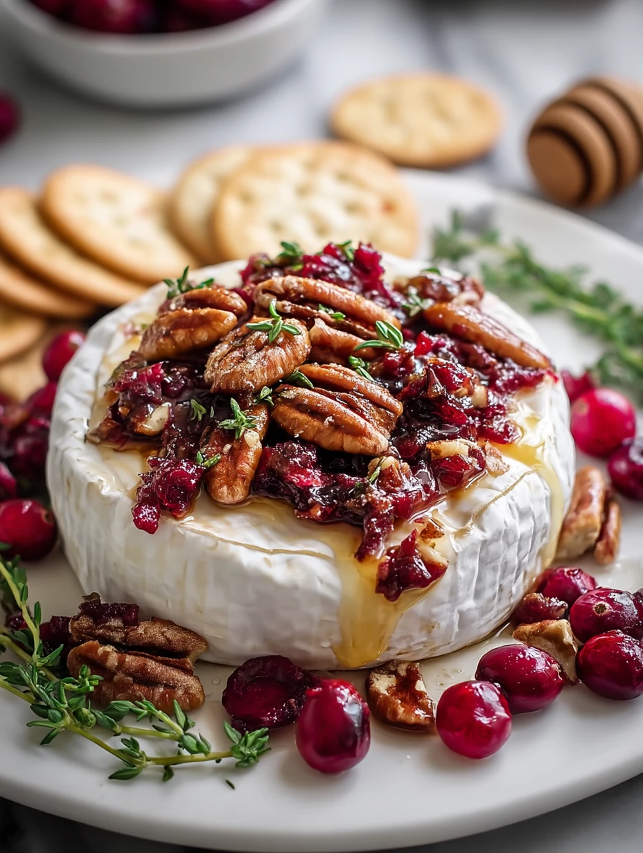 Perfect for entertaining or indulging in a cozy night at home, this baked brie transforms ordinary ingredients into an eye-catching centerpiece. The creaminess of the cheese paired with the crunch of pecans and the zing of cranberry sauce makes every bite irresistibly balanced.