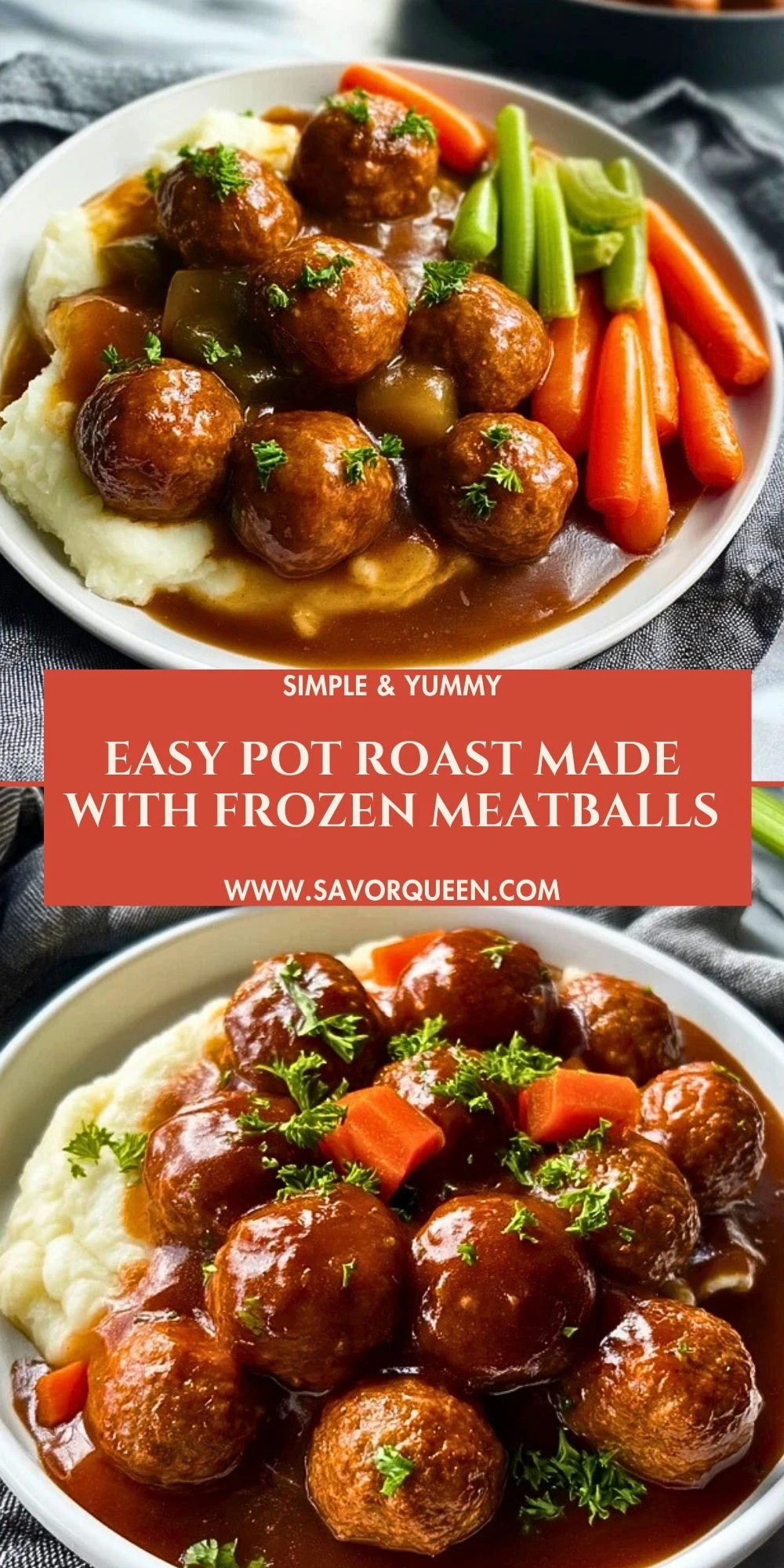 Craving cozy pot roast flavor but don’t have time to babysit a roast in the oven? This Easy Pot Roast Made With Frozen Meatballs gives you all the rich, slow-cooked taste with almost zero effort. Frozen meatballs simmer low and slow with carrots, celery, onion, and a savory brown gravy until everything is tender and spoon-worthy. Serve it over fluffy mashed potatoes, rice, or egg noodles for the ultimate comfort food. It’s a perfect easy dinner for busy weeknights, a no-stress family meal, and one of my favorite go-to dinner ideas when I need a warm, hearty, easy recipe fast. This dish also reheats beautifully, so it’s great for meal prep, leftovers, and simple food ideas for the week ahead.