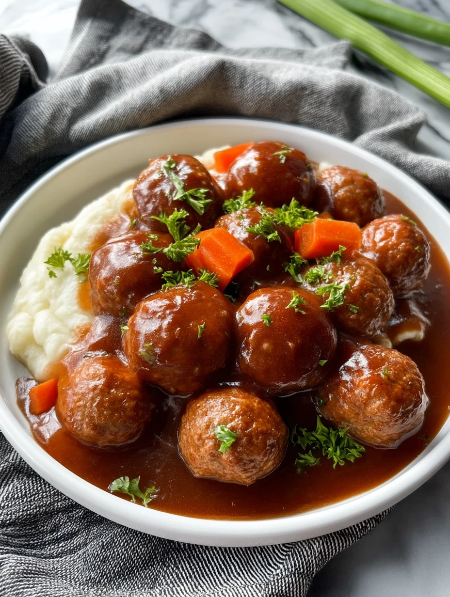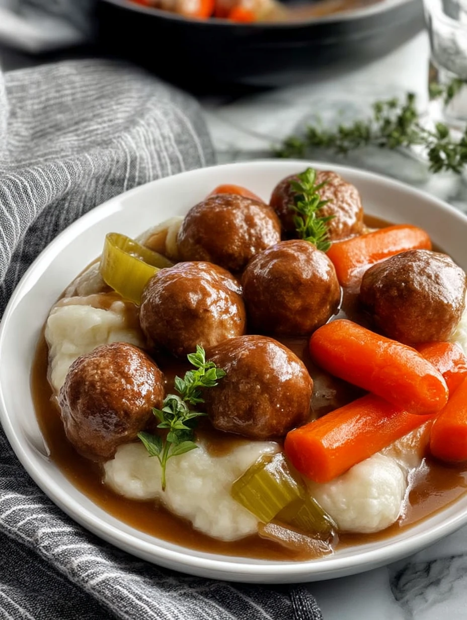 Spoon a generous bed of mashed potatoes, rice, or buttered egg noodles into bowls or onto plates. Ladle the meatballs, vegetables, and plenty of gravy over the top. I love to finish each serving with a grind of black pepper and a sprinkle of fresh parsley for color.