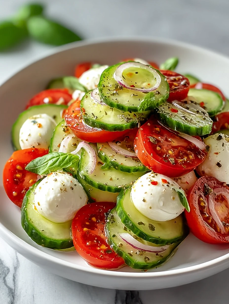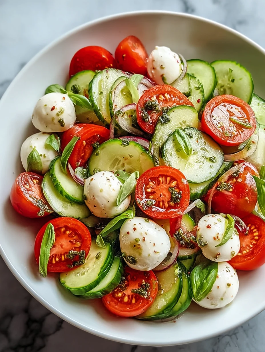 Looking for a quick, healthy side dish that screams summer? This Fresh Cucumber Caprese Salad brings together the vibrant crunch of cucumbers, juicy cherry tomatoes, creamy mozzarella pearls, and fresh basil—all drizzled in a zesty balsamic vinaigrette. It’s the perfect blend of crisp textures and bold, garden-fresh flavors. Whether you’re planning a picnic, BBQ, or want a light dish to go with grilled meats or soups, this salad fits right in. It’s great as a healthy snack, a colorful appetizer, or a refreshing choice for your easy dinner or lunch ideas.