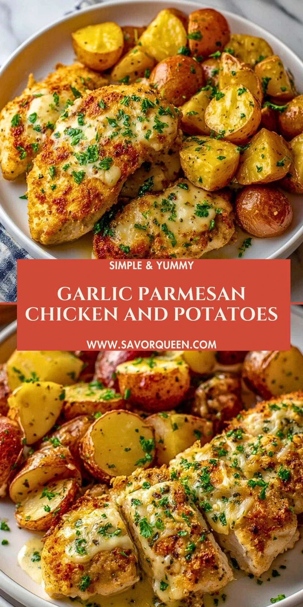 Keywords: garlic parmesan chicken and potatoes, easy dinner, one pan meal, sheet pan chicken, quick dinner, comfort food, chicken and potatoes recipe