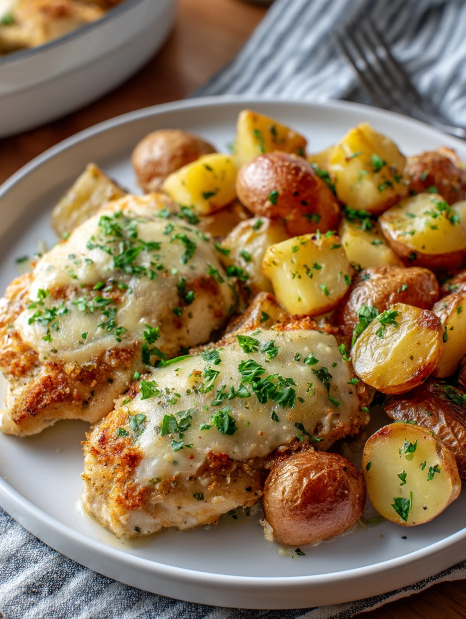Golden roasted potatoes, juicy chicken, and a rich, buttery garlic-Parmesan sauce all on one plate—this is the kind of cozy dinner that makes everyone race to the table. Each bite gives you crisp edges, tender centers, and a creamy, cheesy finish that tastes like it came from your favorite neighborhood bistro.