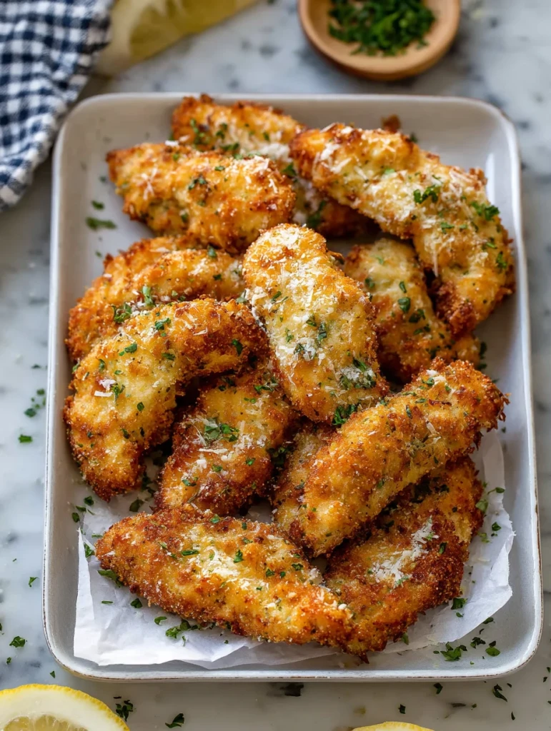 Transfer cooked tenders to a paper towel-lined plate. Let rest for a couple of minutes, sprinkle with extra parmesan and parsley, and serve hot.