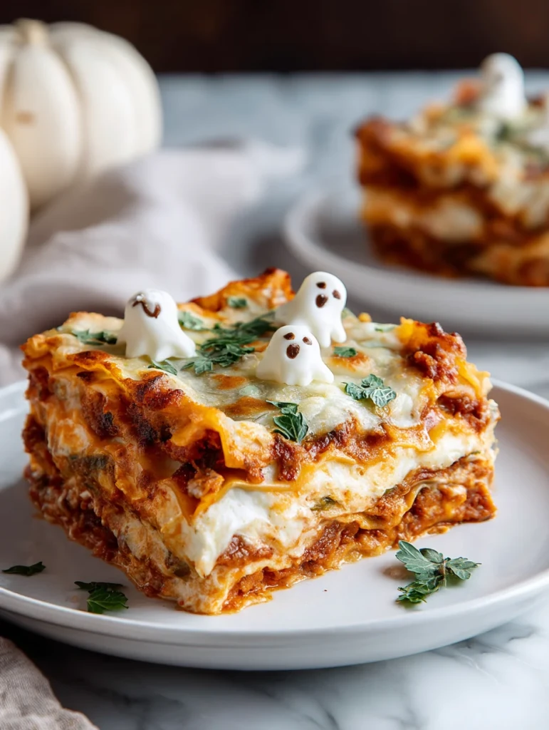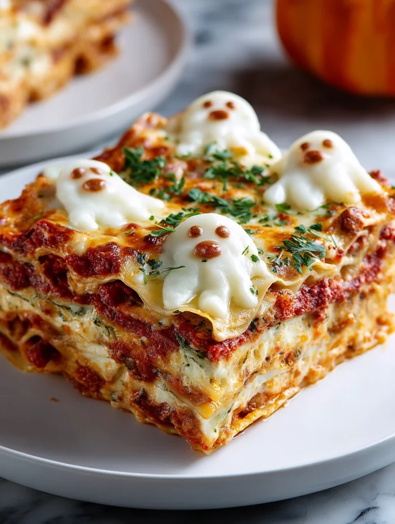 Think classic lasagna, but with layers of creamy ricotta, melty mozzarella, hearty spinach, and zesty marinara—then crowned with ghost-shaped mozzarella that makes everyone smile before they even take the first bite. It’s festive, flavorful, and exactly what you want for a fall family dinner.