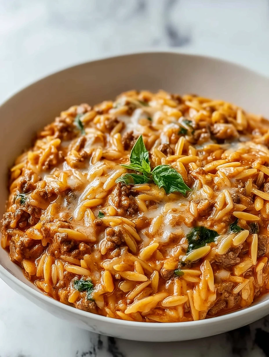 Keywords: quick dinner, easy recipe, ground beef pasta, orzo dinner, comfort food, one pot meals