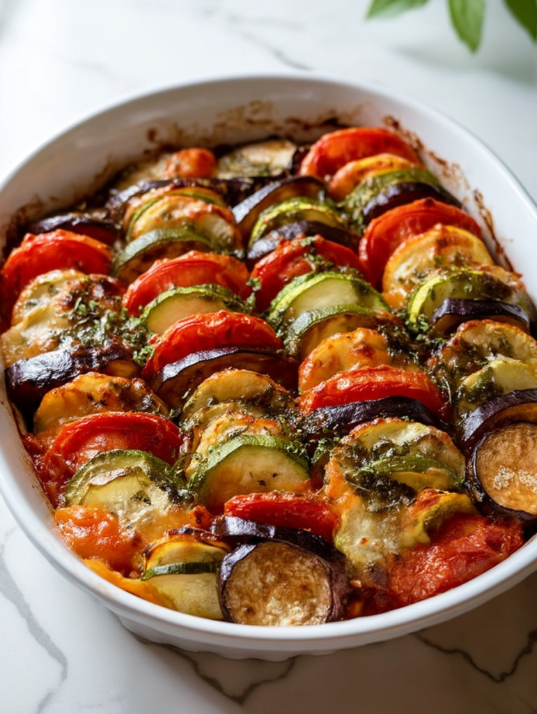 Colorful, wholesome, and packed with flavor, this Healthy Baked Ratatouille Zucchini, Tomato & Eggplant Medley is the kind of dish that turns simple vegetables into a true showstopper. Sliced thin and arranged like art, the vibrant layers roast down into a tender, savory medley that fills your kitchen with the scent of garlic, herbs, and sunshine.