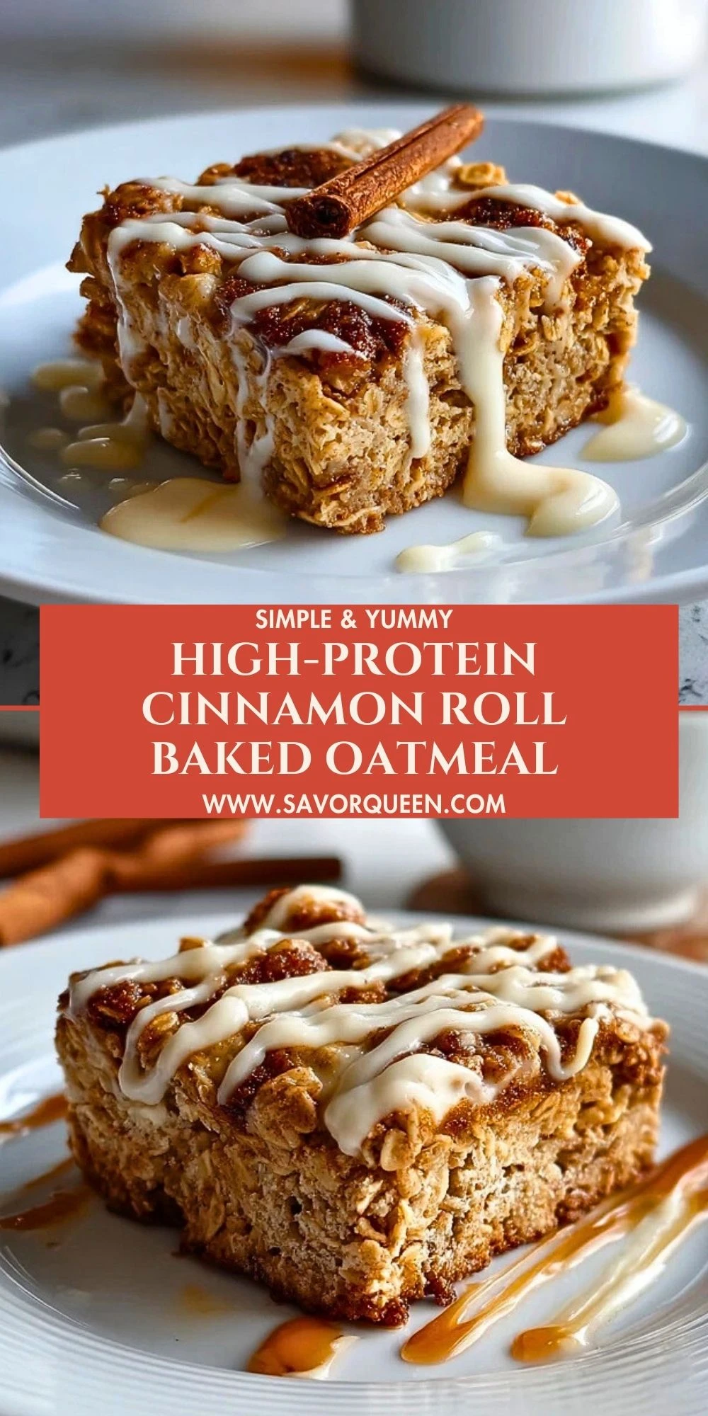 Keywords: high protein breakfast, baked oatmeal, cinnamon roll oatmeal, healthy snack, meal prep breakfast, easy breakfast recipe