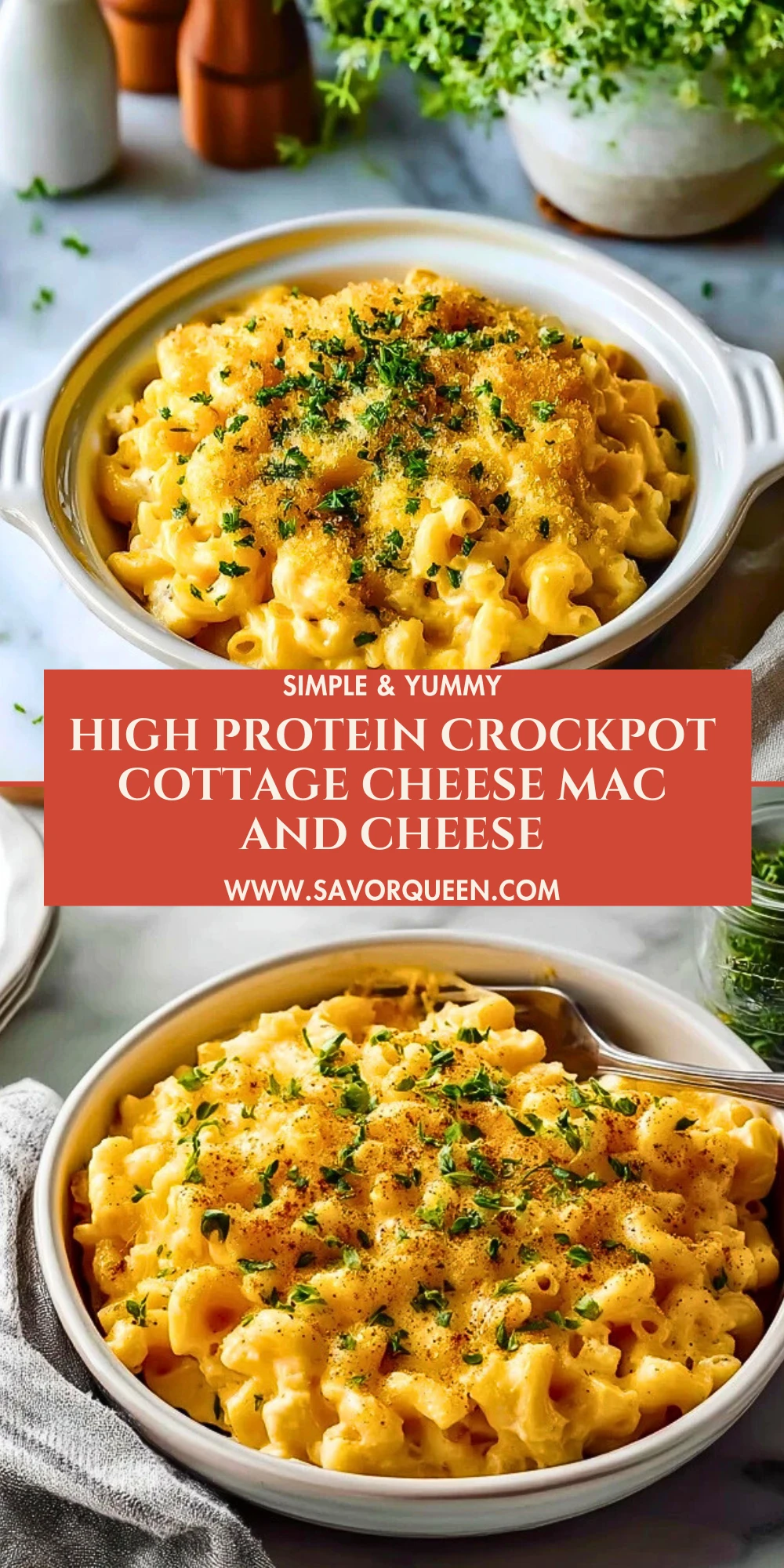 Keywords: high protein mac and cheese, crockpot mac and cheese, cottage cheese mac and cheese, slow cooker dinner, easy dinner, comfort food, pasta recipe, cheesy pasta