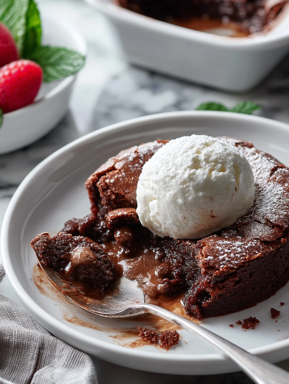 What I love most is how deceptively simple it is. The batter comes together with everyday baking staples, but once it bakes, it transforms into something that feels dinner-party worthy. I like serving it warm with a scoop of vanilla ice cream so the cold cream melts right into the fudgy center.