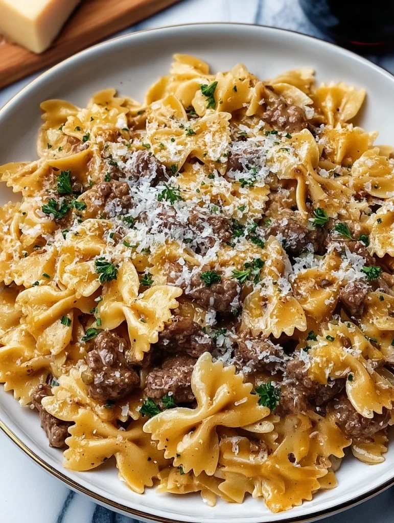 Indulgent Garlic Parmesan Bowtie Pasta with Creamy Beef