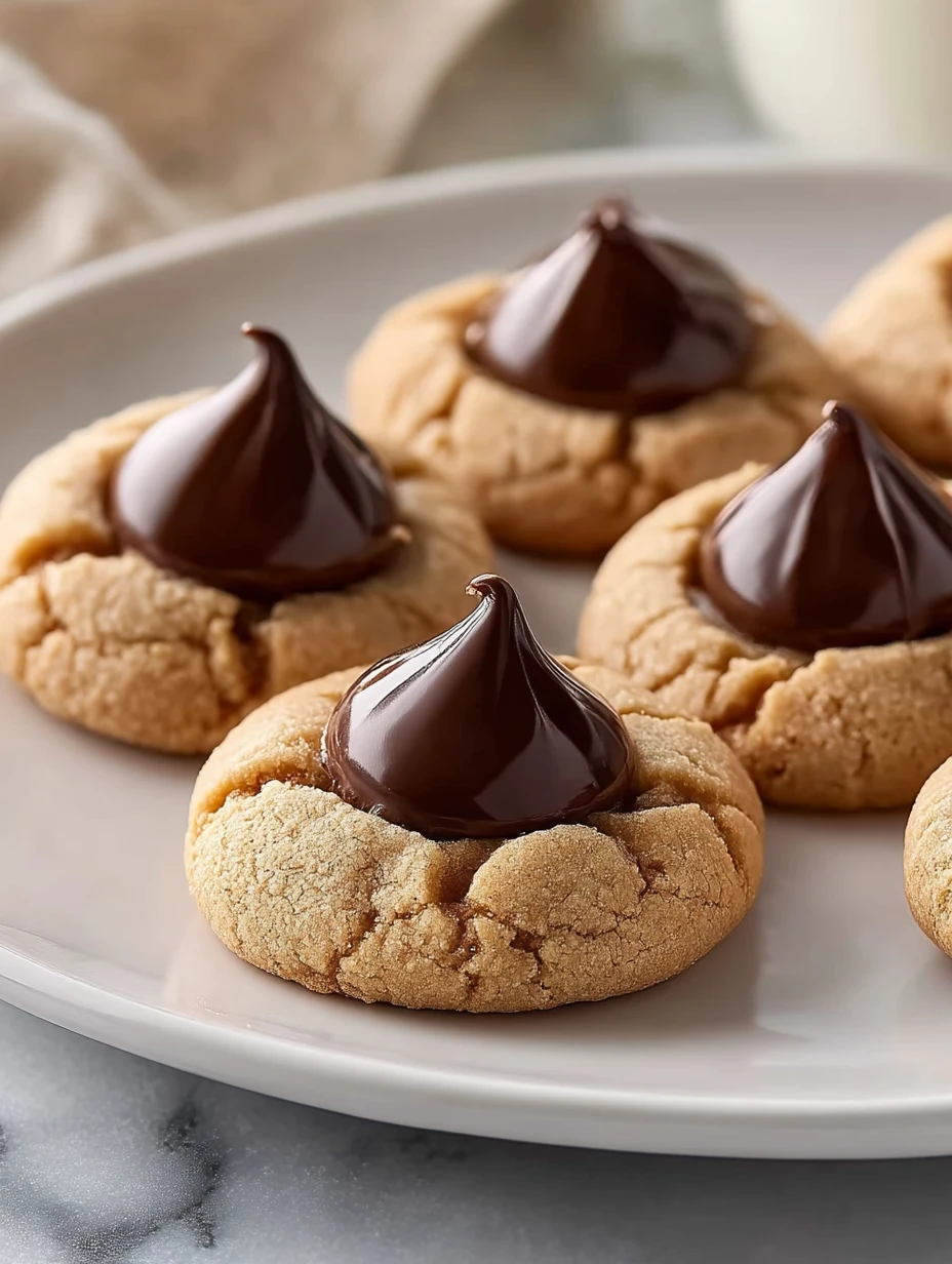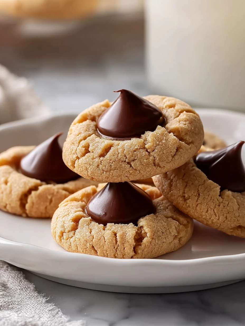These peanut butter blossoms are delicious served slightly warm with melty chocolate centers or fully cooled for a more set texture. They pair perfectly with a glass of cold milk or hot cocoa.