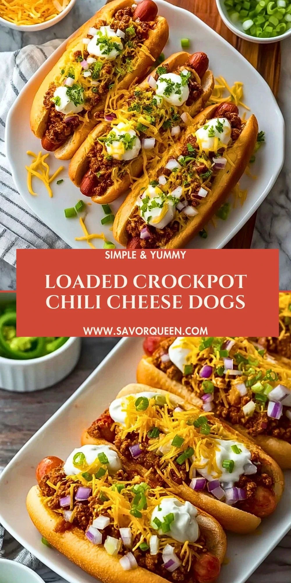 Craving a crowd-pleasing comfort food that practically cooks itself? These Loaded Crockpot Chili Cheese Dogs are my go-to easy dinner when I need fun, no-fuss dinner ideas everyone will devour. Juicy hot dogs simmer in rich, homemade chili until they’re bursting with flavor, then get smothered in melty cheddar, fresh onions, and green onions. It’s the kind of easy recipe that works for busy weeknights, game day parties, or anytime you need cozy food ideas without heating up the kitchen.
