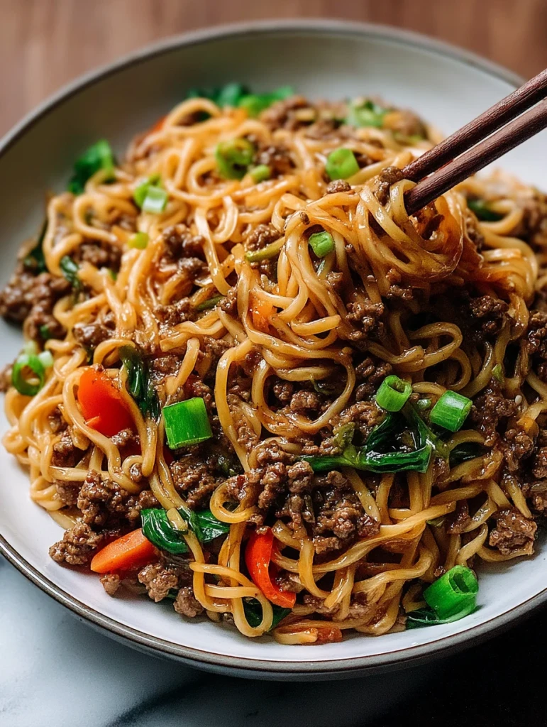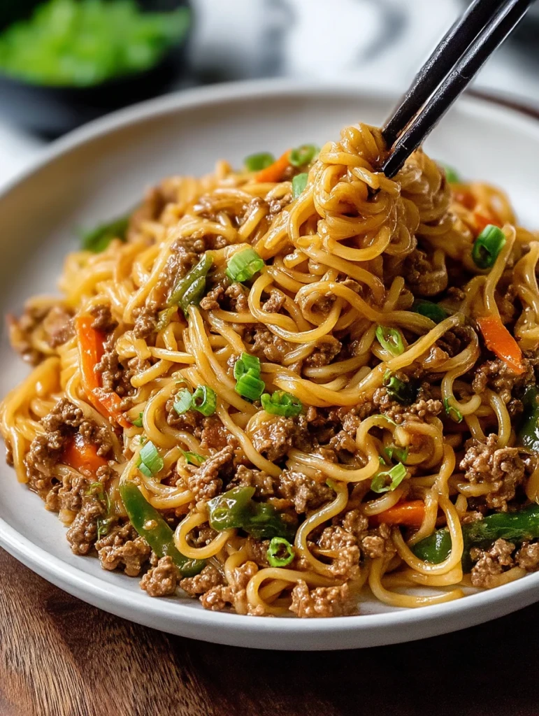 Ground Beef – The star of the show. It adds hearty protein and soaks up the bold Mongolian-style sauce beautifully.