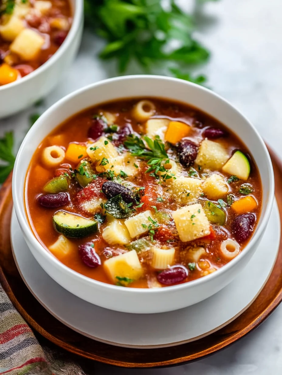 Serve this Minestrone hot with a sprinkle of fresh parsley or grated Parmesan (optional if keeping it vegan). A slice of crusty bread or a garlic knot makes it a cozy meal.