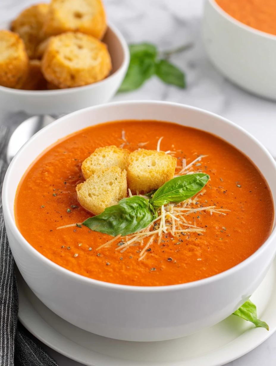 Serve hot, topped with croutons, shredded Parmesan, and fresh basil. It pairs perfectly with a crusty grilled cheese sandwich or a slice of sourdough bread.