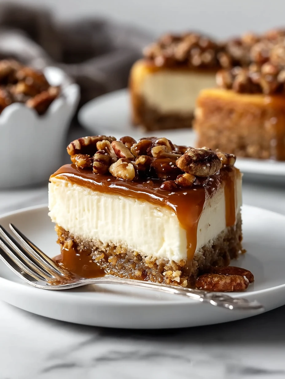 Pour the pecan topping evenly over the cheesecake. Chill for at least an hour before slicing to allow the topping to set.